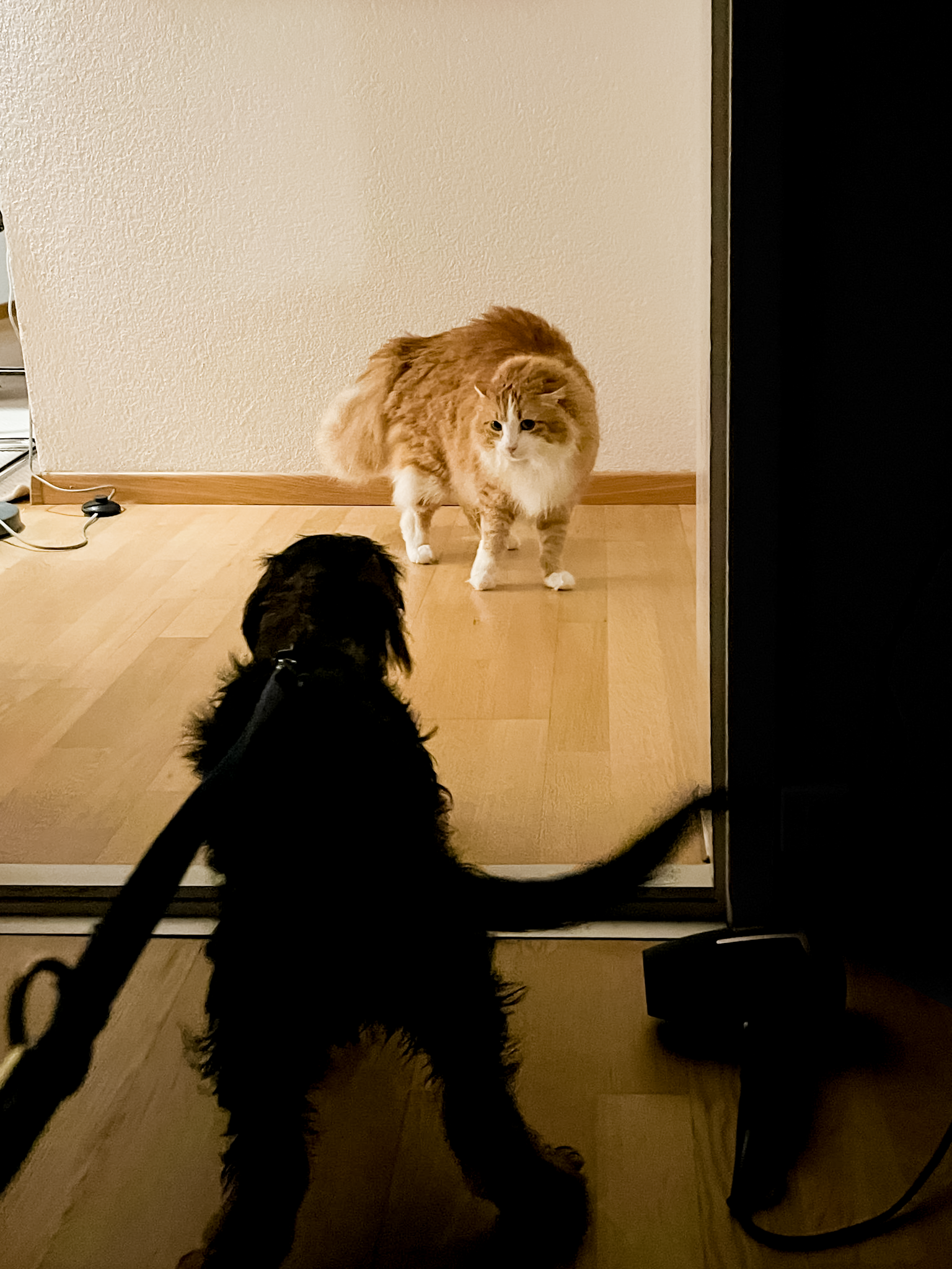 In einer Wohnung wird dies schwieriger. Gleich bei der Ankunft bemerkt Frieda den stattlichen Norwegerkater in der Wohnung – und möchte auch sogleich mit ihm spielen. Clarence ist von dieser Idee aber nicht sonderlich begeistert und verschwindet rasch unter das Bett. Davon lässt sich Frieda aber nicht abhalten. Unablässig tänzelt sie ums Bett und reckt den Kopf, soweit es geht, darunter. Immer wieder ist ein Fauchen, bisweilen ein tiefes Knurren zu hören. Doch diese Warnsignale scheint die junge Hündin nicht zu verstehen. Schwanzwedelnd hüpft sie weiter um das Bett herum.