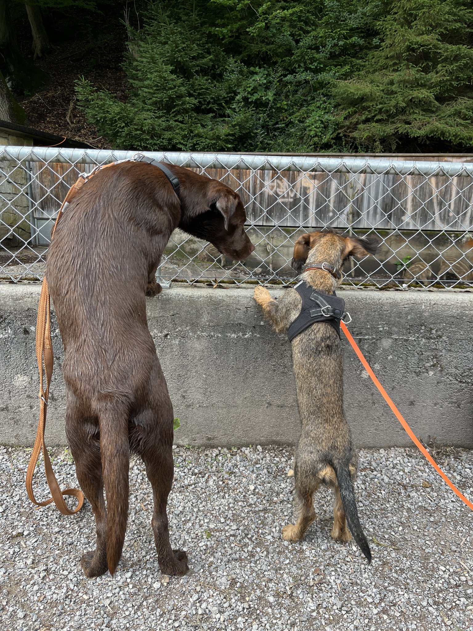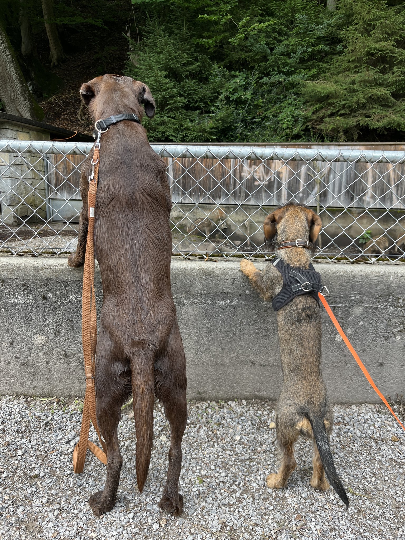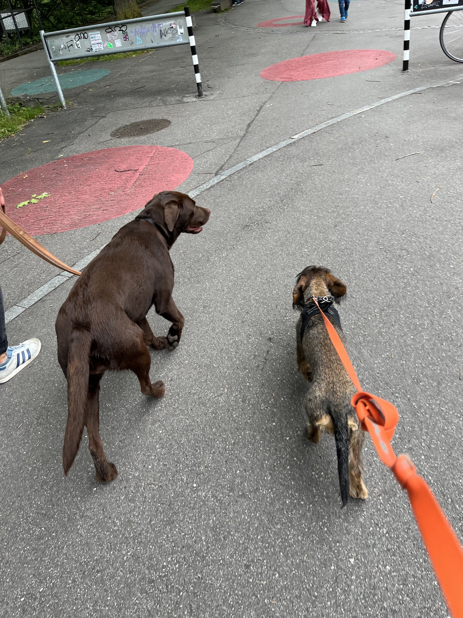 Als der Kaffeeklatsch beendet war, hiess es Leinen an und raus. Der Aare entlang bis zum Tierpark Dählhölzli und von dort aus mitten in die Stadt führte unser Weg. Frieda fand das super für einmal nicht allein, sondern in Begleitung einer erfahrenen Hundefreundin unterwegs zu sein. Motiviert marschierten die beiden nebeneinander her, schnupperten gemeinsam den Wegesrand ab, tollten über die Wiesen und beobachteten die Wildschweine im Tiergehege. Sogar die lauten Trams jagten Frieda in Begleitung viel weniger Angst ein als sonst. Nur ins Wasser wagte sich die kleine Dackeldame noch immer nicht, auch wenn Mavi ihr aufs Schönste demonstrierte, wie lustig und erfrischend ein kurzes Flussbad sein kann.