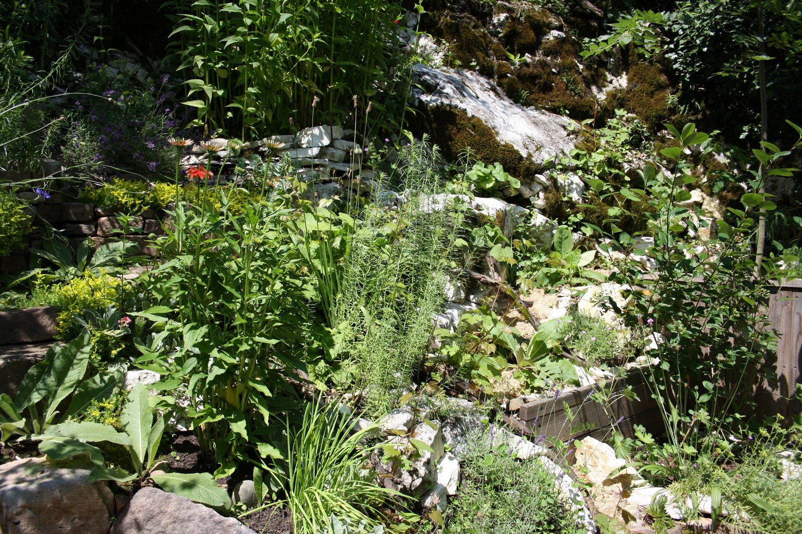 Die gelernte Gipserin grub die Erde um, säte Wildblumen, baute Trockenmauern, häufte Äste an und richtete ein System mit Regentanks sowie eine Steintreppe über drei Ebenen ein, um sich am Steilhang besser bewegen zu können. «Die Gartenarbeit gibt mir den perfekten Ausgleich zum Sägen, denn meine Bandscheibe macht es nicht mehr mit, mehrere Stunden lang dasselbe zu machen», erklärt Zwahlen. Auch stillsitzen oder liegen gehe manchmal nicht. Das Beobachten der Pflanzen und Tiere bietet eine willkommene Abwechslung für die energiegeladene 44-Jährige. Heute ist die Böschung kaum wiederzuerkennen. An allen Ecken und Enden spriessen wertvolle Wildblumen für Schmetterlinge wie der Wilde Dost, aber auch Fenchel, essbare Kräuter und Heilpflanzen. Kein Wunder, tummeln sich in den unterschiedlichen Beeten und Kleinstrukturen nicht nur Summervögeli (Schmetterlinge), sondern auch unzählige Bienen und Käfer in allen erdenklichen Farben.