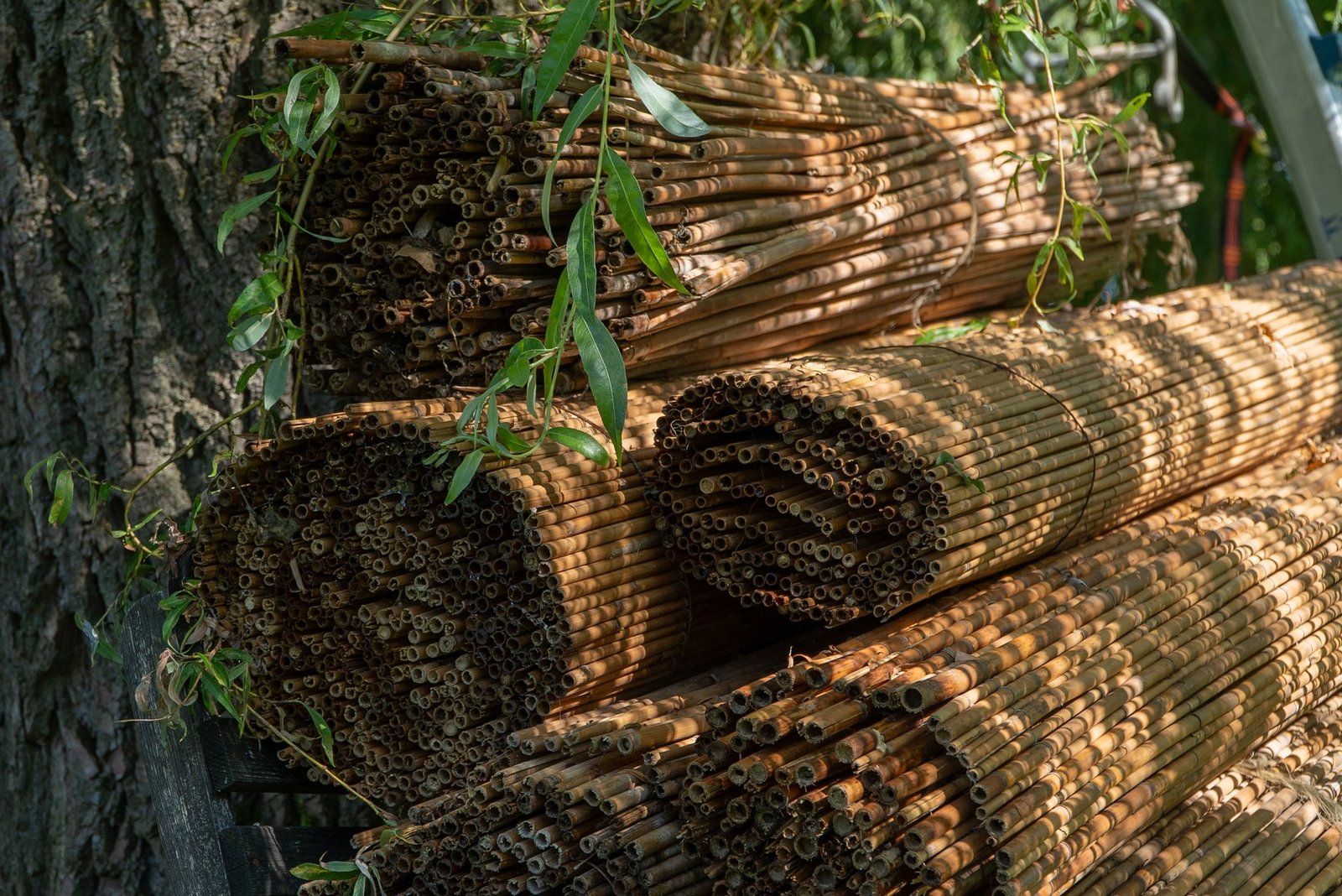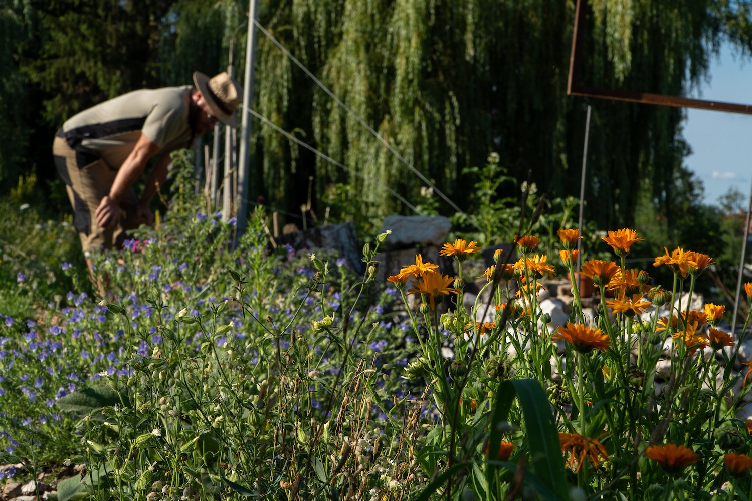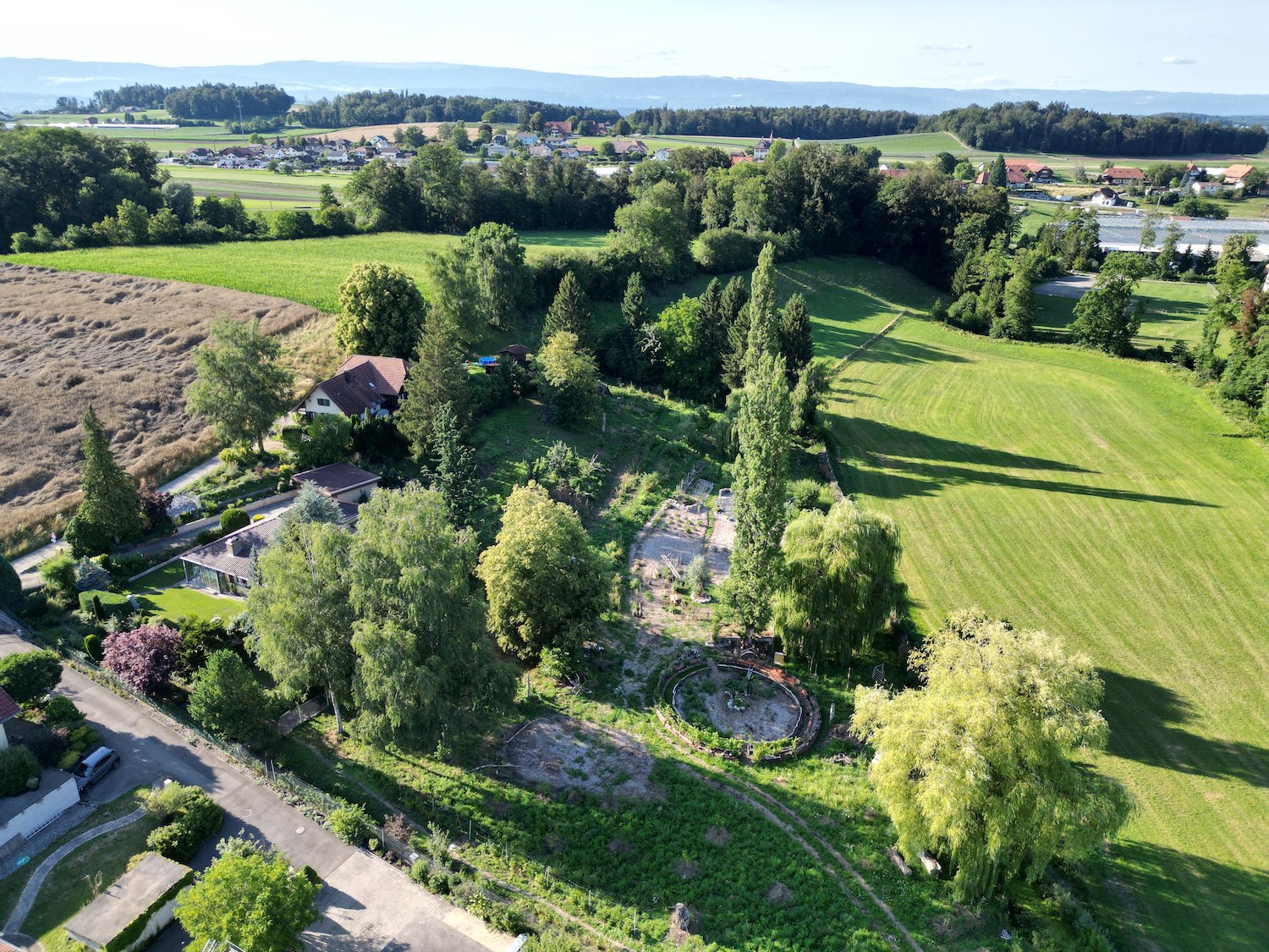 Nach diesem Prinzip hat Jeutter auch die 8000 Quadratmeter gestaltet: Vor der prächtigen Weide beim Eingang des Gartens wachsen links und rechts zwei Reihen wilder und alter einheimischer Obstsorten, die sich rings um das Herz des Projektes legen. Das Herz ist ein fast mannshoher Komposthaufen mit einem Sandarium daneben, das als Kreis ausgelegt ist. Um das zu bauen, hat der selbständige Maler ein Jahr lang über 10 000 Dachziegeln gesammelt und sie in drei Reihen im Kreis aufeinandergelegt, sodass sie als Sonnenfalle dienen. Dahinter gedeiht ein Gemüsegarten auf Mulch, den Jeutter mit Mähgut aus dem Garten düngt und feucht hält.