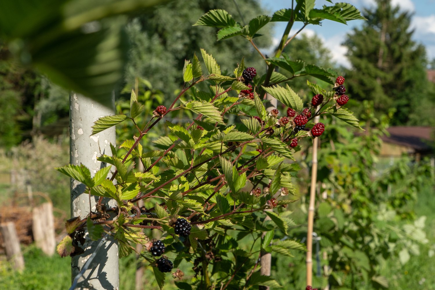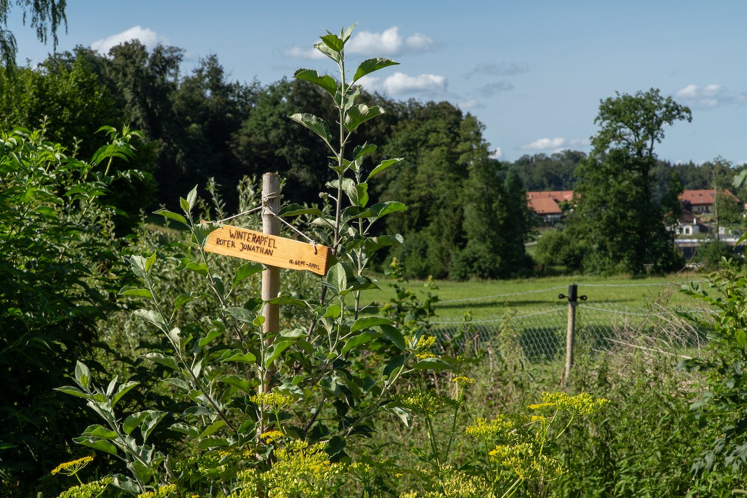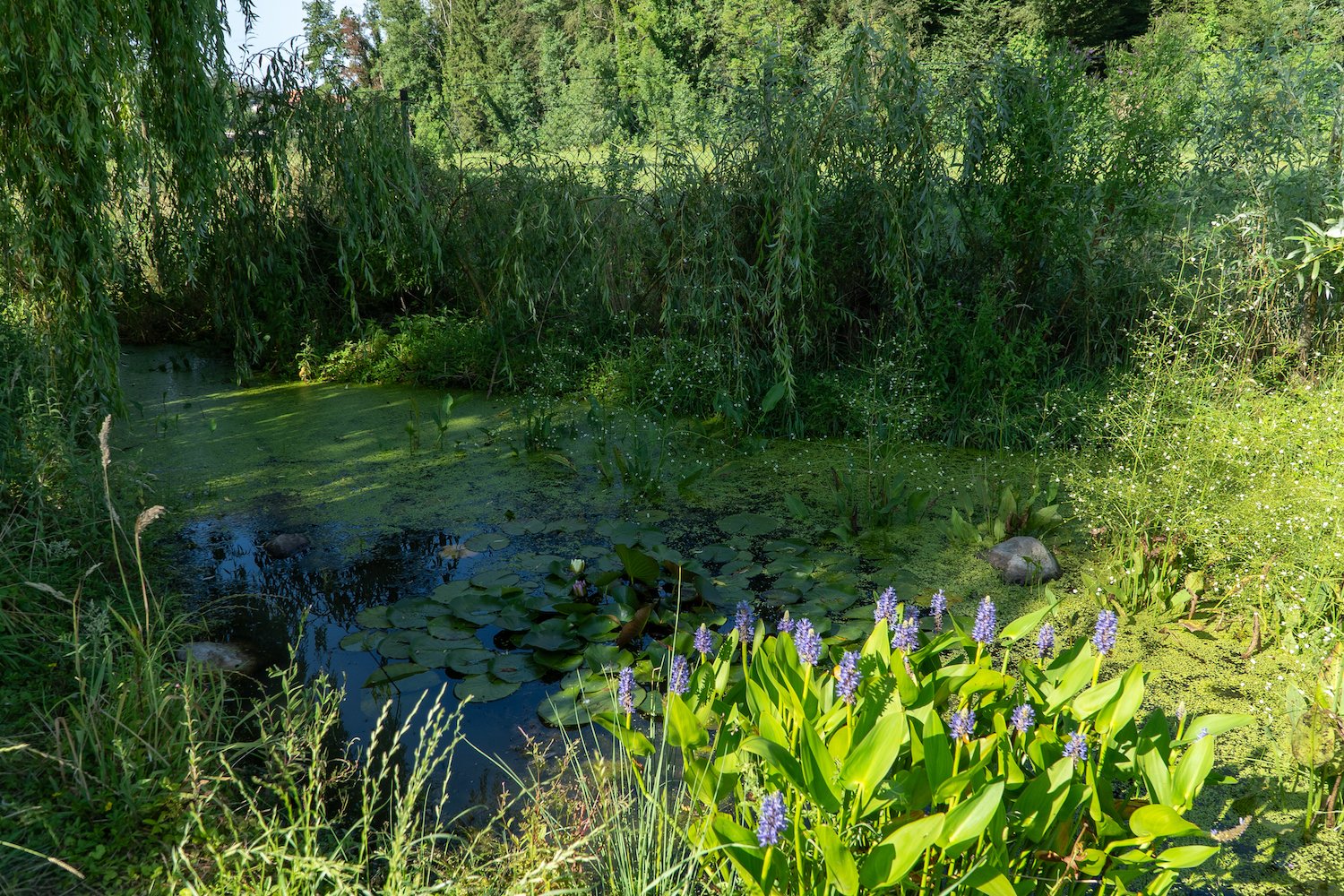Seit 12 Jahren hat er schon die Vision eines grossen naturnahen Gartens, der auch zur Selbstversorgung dient. In Ulmiz ergab sich die passende Gelegenheit und er konnte sich den Traum eines eigenen, nicht ganz so kleinen, Tier- und Pflanzenparadieses erfüllen. «Ich war schon als Kind sehr naturverbunden», sagt er über seine Kindheit, die er auf dem Land verbringen durfte und freut sich, wenn Bienen und Schmetterlinge sich über die Blütenpracht in seinem Garten hermachen. Für Reptilien und Kleinsäugetiere hat er mehrere Stein- und Asthaufen aufgestellt und eine fast 100 Meter lange Benjeshecke an der Grenze zum Nachbaren aufgezogen. Diese will er in Zukunft um den ganzen Garten ziehen. Frösche und Libellen fühlen sich in den drei Teichen wohl, die bei der Hecke einen feuchten Lebensraum bieten.