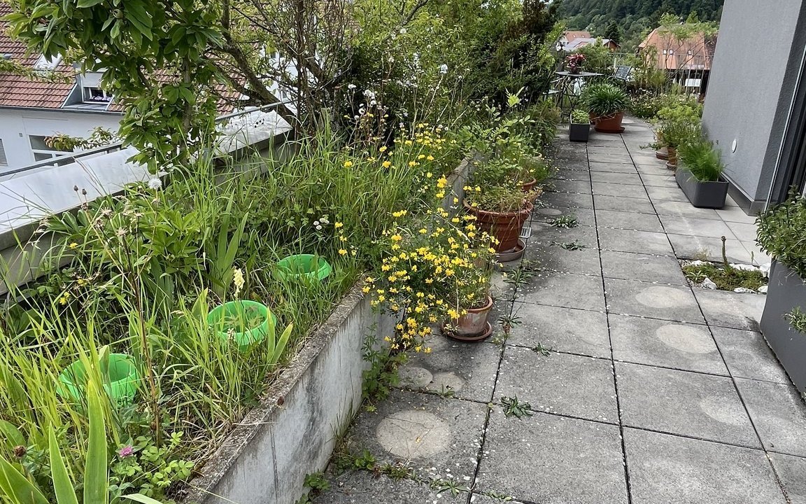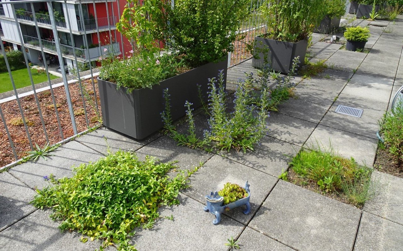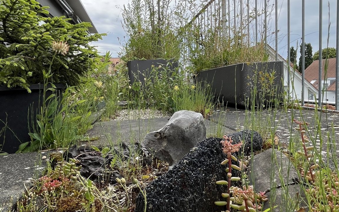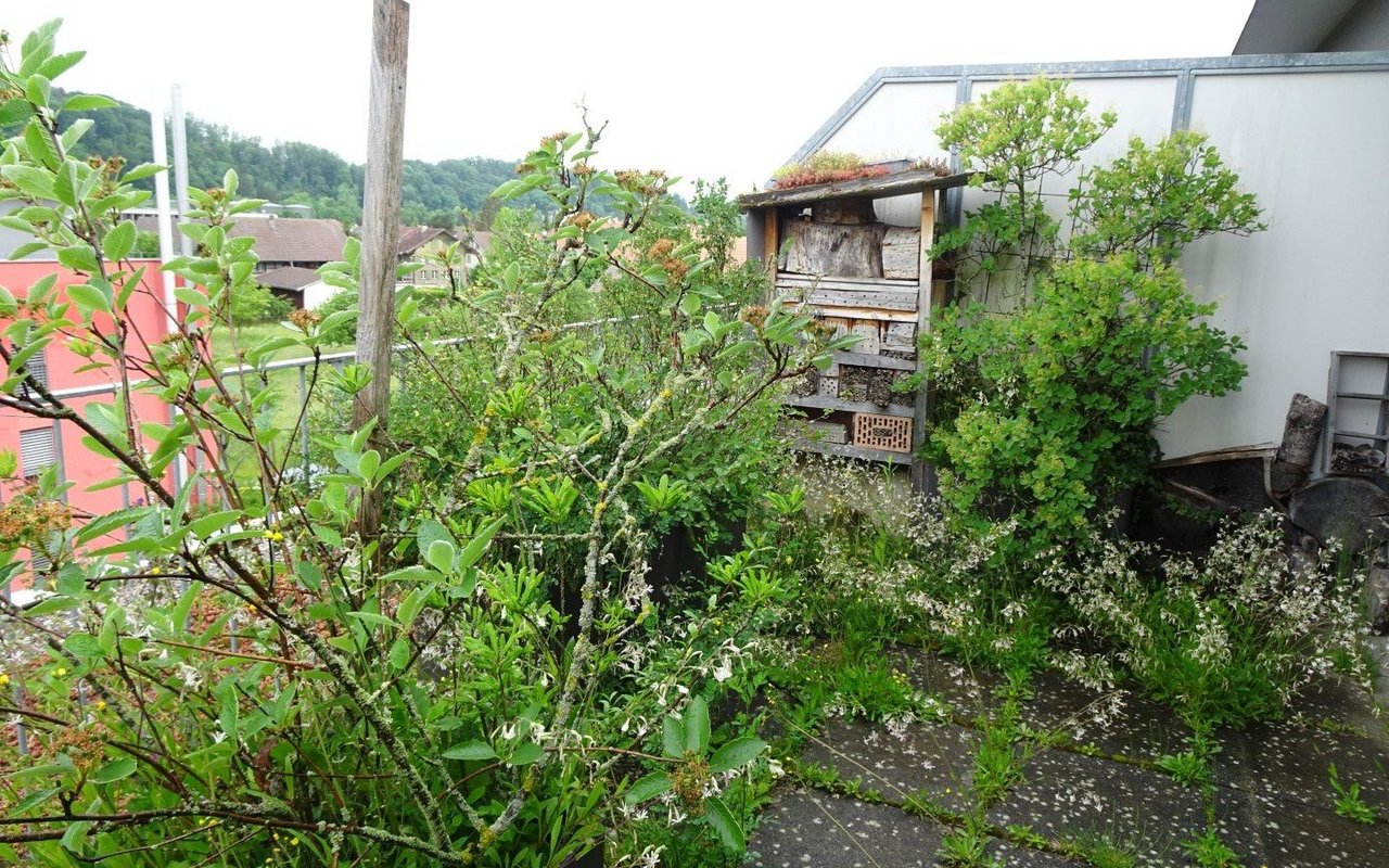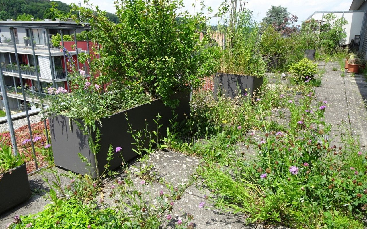 Vor 14 Jahren sind Markus Graf-Meyer und seine Frau in die Attikawohnung im 3. Obergeschoss eingezogen. Bereits vor Fertigstellung des Wohnkomplexes und dem bevorstehenden Einzug war es dem 70-Jährigen ein Anliegen, die 100 Quadratmeter grosse Terrasse mit angrenzendem Vordach zu begrünen und somit möglichst früh bei der Planung teilzunehmen sowie Vorschläge einzubringen. Einer dieser Vorschläge war ein 13 Meter langer Pflanzentrog, der später eine Vielzahl von einheimischen Pflanzen beheimaten sollte. Nach mehreren Gesuchen, Bewilligungen und dem Einverständnis der anderen Wohnparteien konnte aus der zuerst geplanten Sterilität ein grünes Paradies mit verschiedenen Lebensräumen entstehen.