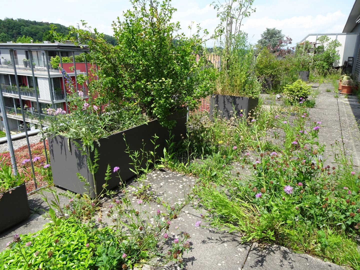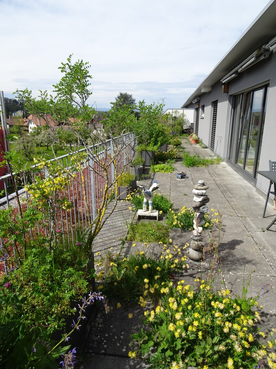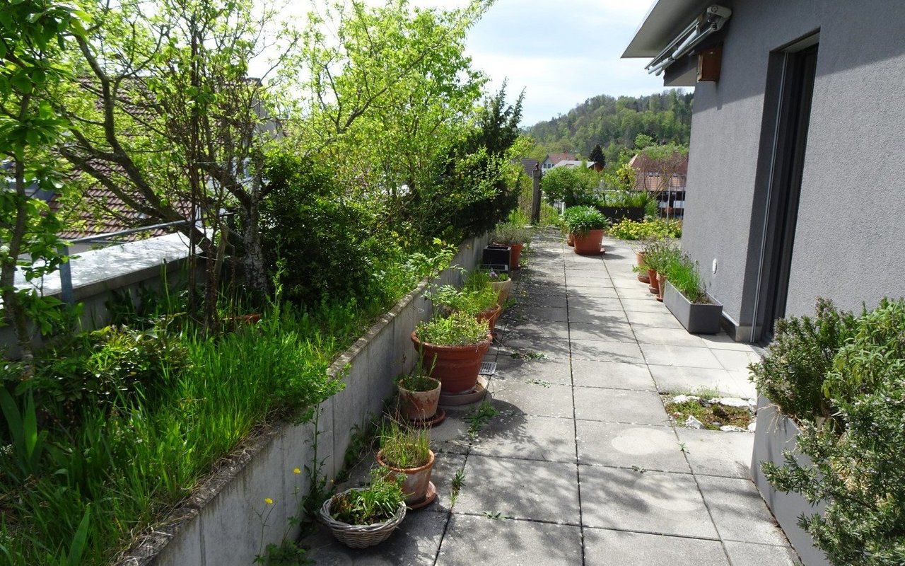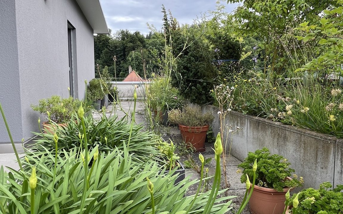 Vor 14 Jahren sind Markus Graf-Meyer und seine Frau in die Attikawohnung im 3. Obergeschoss eingezogen. Bereits vor Fertigstellung des Wohnkomplexes und dem bevorstehenden Einzug war es dem 70-Jährigen ein Anliegen, die 100 Quadratmeter grosse Terrasse mit angrenzendem Vordach zu begrünen und somit möglichst früh bei der Planung teilzunehmen sowie Vorschläge einzubringen. Einer dieser Vorschläge war ein 13 Meter langer Pflanzentrog, der später eine Vielzahl von einheimischen Pflanzen beheimaten sollte. Nach mehreren Gesuchen, Bewilligungen und dem Einverständnis der anderen Wohnparteien konnte aus der zuerst geplanten Sterilität ein grünes Paradies mit verschiedenen Lebensräumen entstehen.