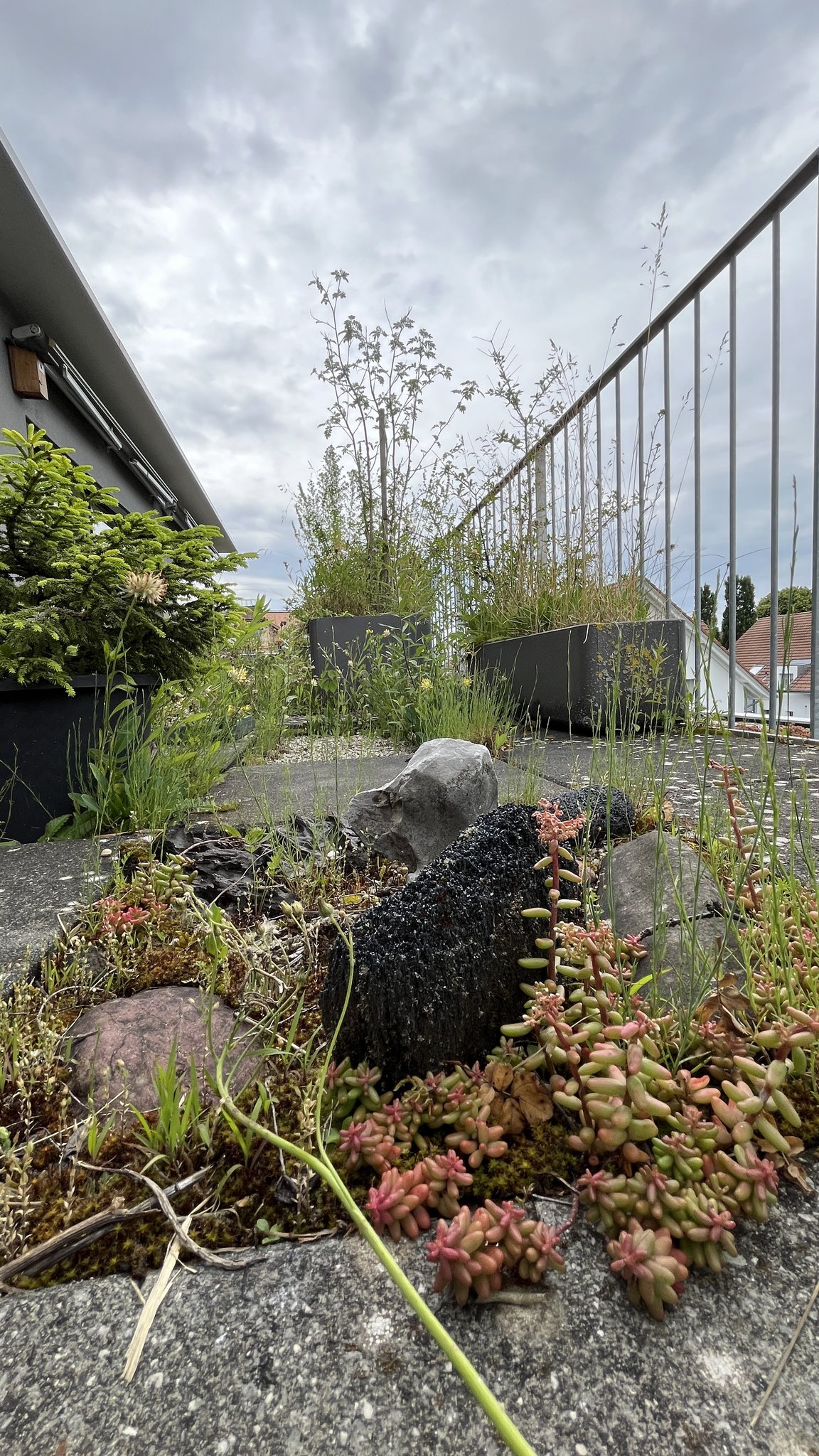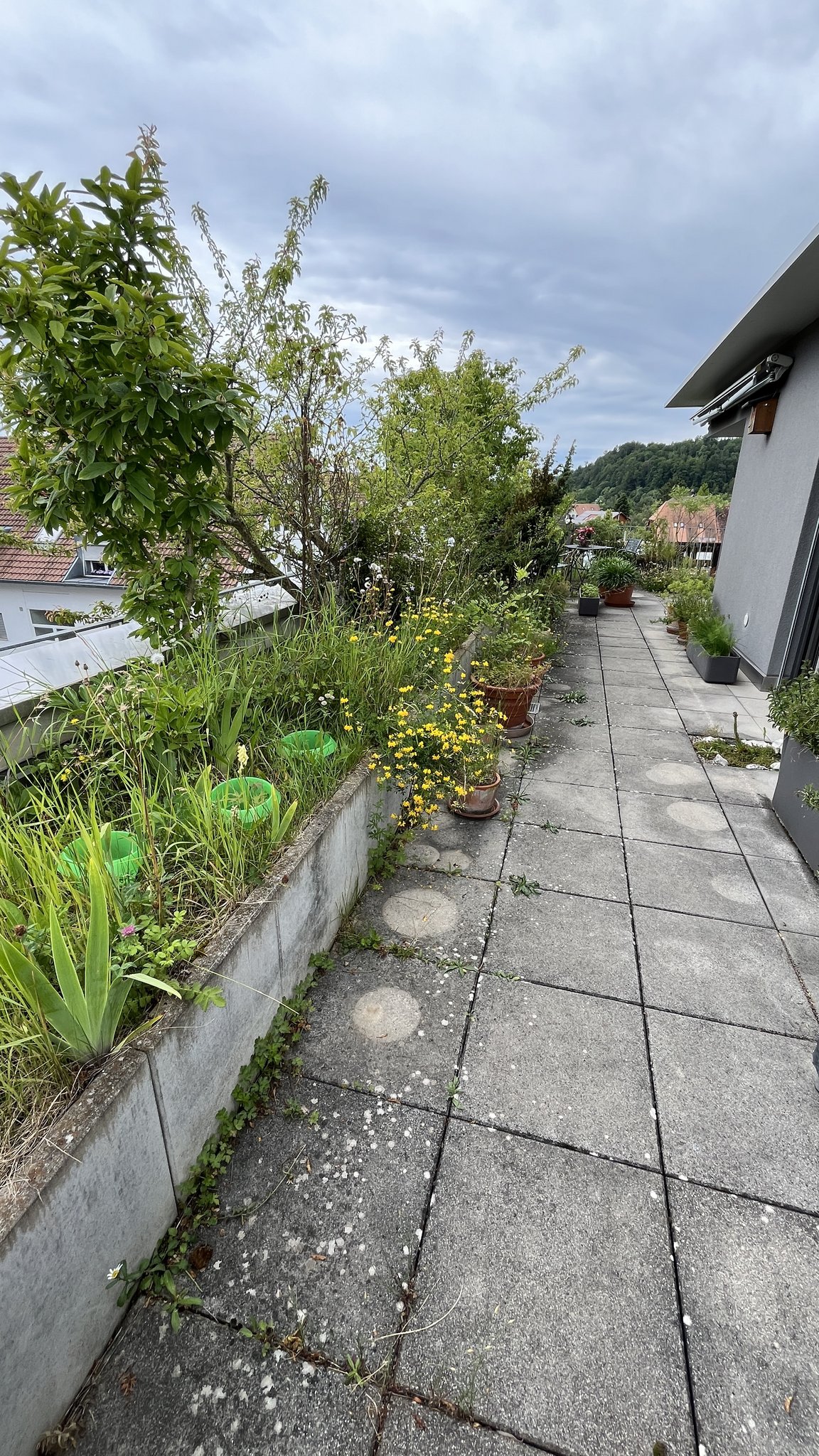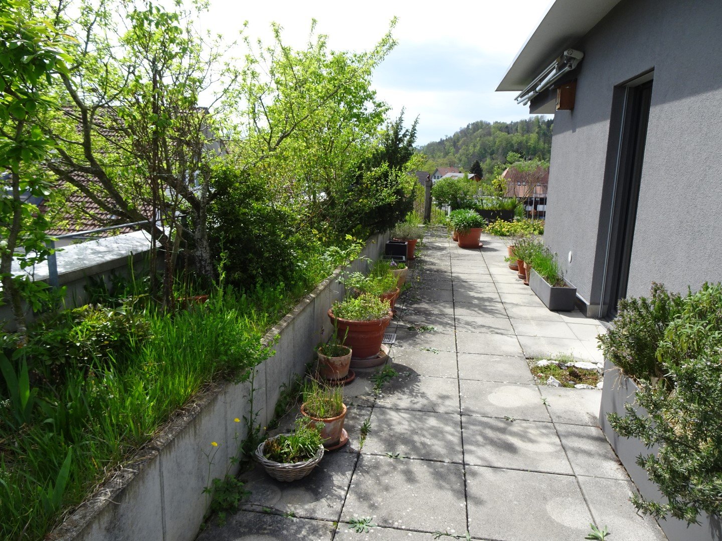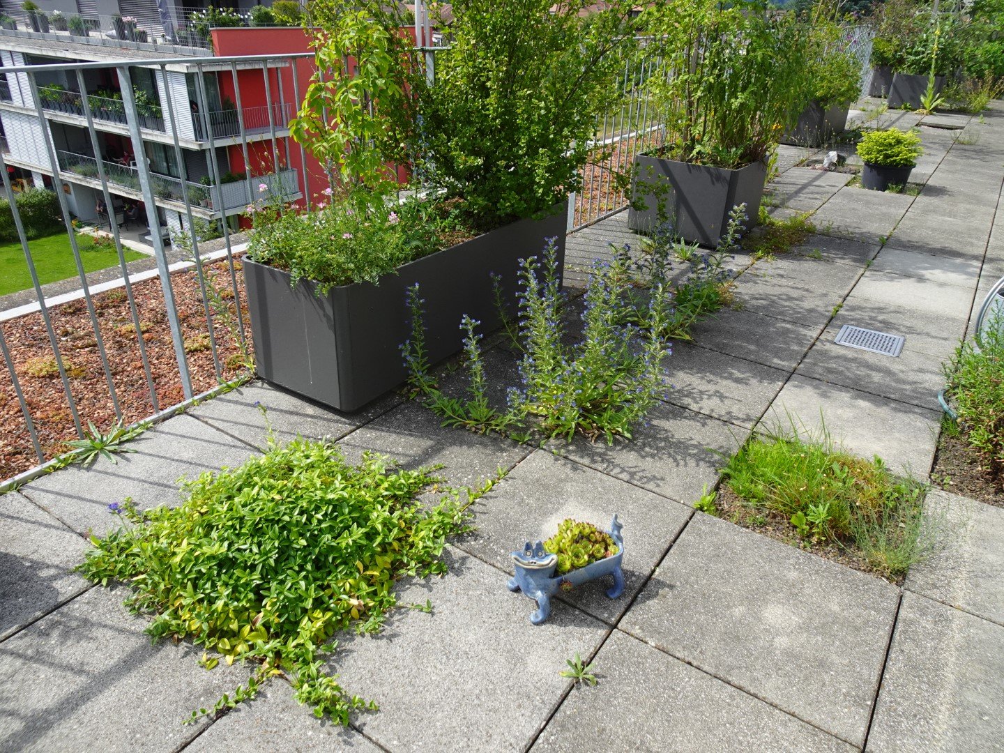 Vor 14 Jahren sind Markus Graf-Meyer und seine Frau in die Attikawohnung im 3. Obergeschoss eingezogen. Bereits vor Fertigstellung des Wohnkomplexes und dem bevorstehenden Einzug war es dem 70-Jährigen ein Anliegen, die 100 Quadratmeter grosse Terrasse mit angrenzendem Vordach zu begrünen und somit möglichst früh bei der Planung teilzunehmen sowie Vorschläge einzubringen. Einer dieser Vorschläge war ein 13 Meter langer Pflanzentrog, der später eine Vielzahl von einheimischen Pflanzen beheimaten sollte. Nach mehreren Gesuchen, Bewilligungen und dem Einverständnis der anderen Wohnparteien konnte aus der zuerst geplanten Sterilität ein grünes Paradies mit verschiedenen Lebensräumen entstehen.