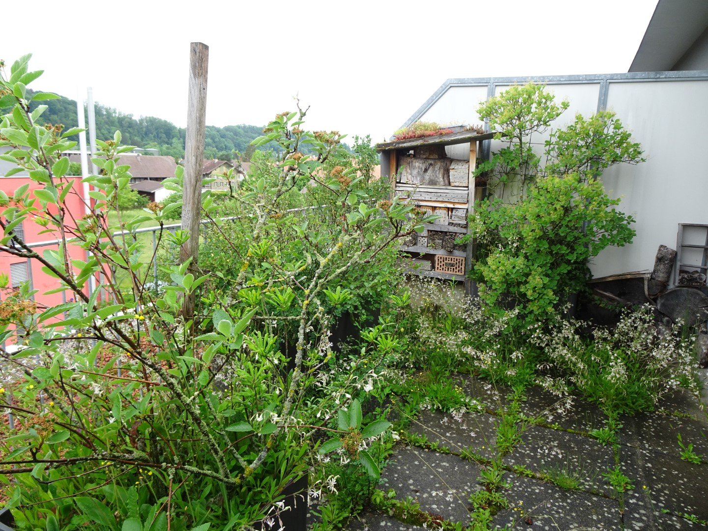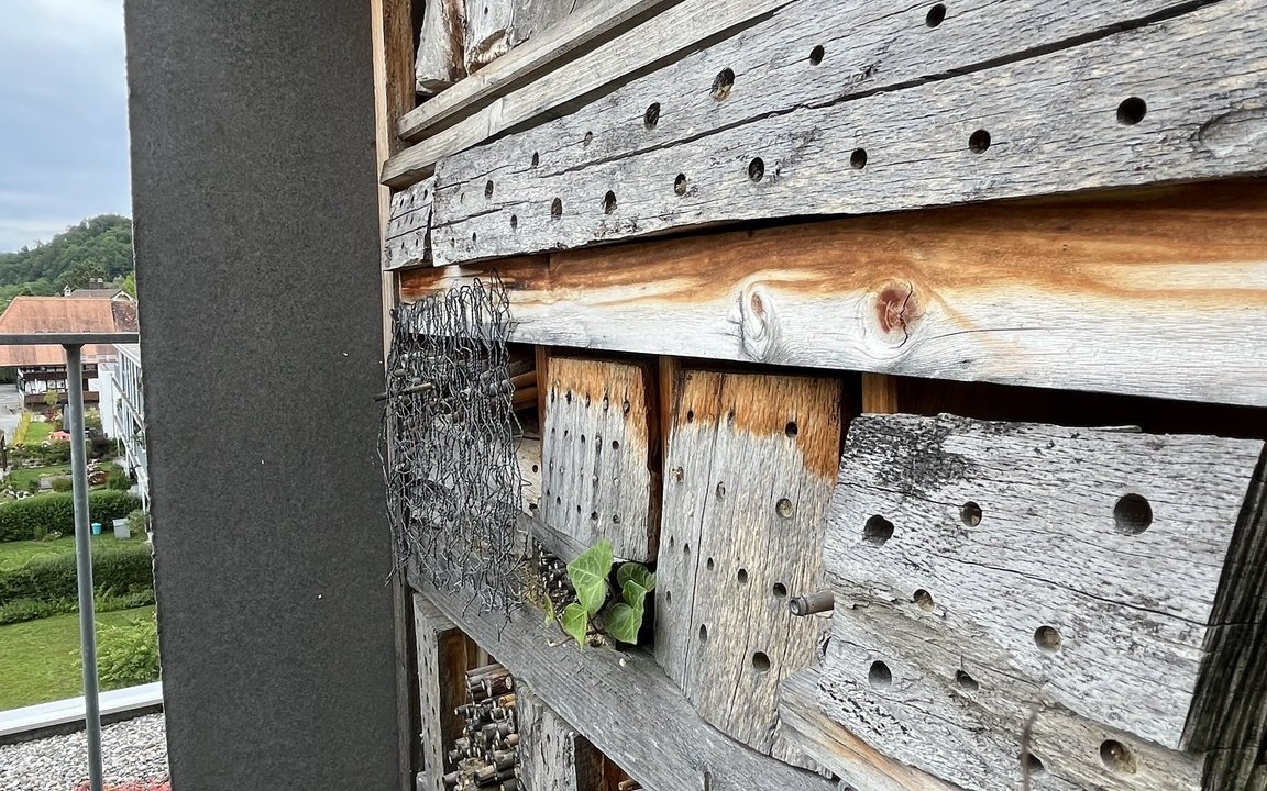 Auf der Terrasse stehen viele biodiverse Blumentöpfe und -kisten. Zusätzlich hat Markus Graf-Meyer vereinzelt Betonplatten entfernt, woraus nun gepflanzte sowie wilde Sträucher und Wildblumen spriessen. Und er hat eine Öffnung gar in eine Tränke umfunktioniert. Aus den Fugen zwischen den Betonplatten wachsen beispielsweise Wundklee, Nickendes Leinkraut und Wiesensalbei. Zudem gedeihen auch einzelne seltene Arten auf dem der Natur überlassenen Balkon, wie Seidelbast, Knäuelglockenblume oder Schweizer Alant. Den Insekten wird neben den reichhaltigen Nahrungsquellen ein selbst gebautes Hotel angeboten und den Vögeln wiederum verschiedene Nistkästen. So nisten Mauersegler, Feldsperlinge, Stare, Kohl- und Blaumeisen unter dem eigenen Vordach rund um die Wohnung. «Wir haben nun nicht nur eine Vielfalt an Pflanzen und Tieren, sondern es ist auch ein Erlebnis, mittendrin zu sein und beobachten zu können», freut sich Markus Graf-Meyer über seinen mit der Natur geteilten Lebensraum.