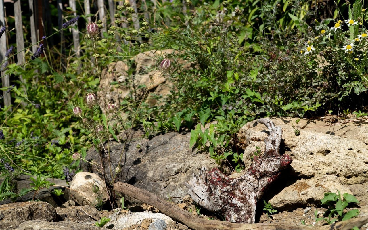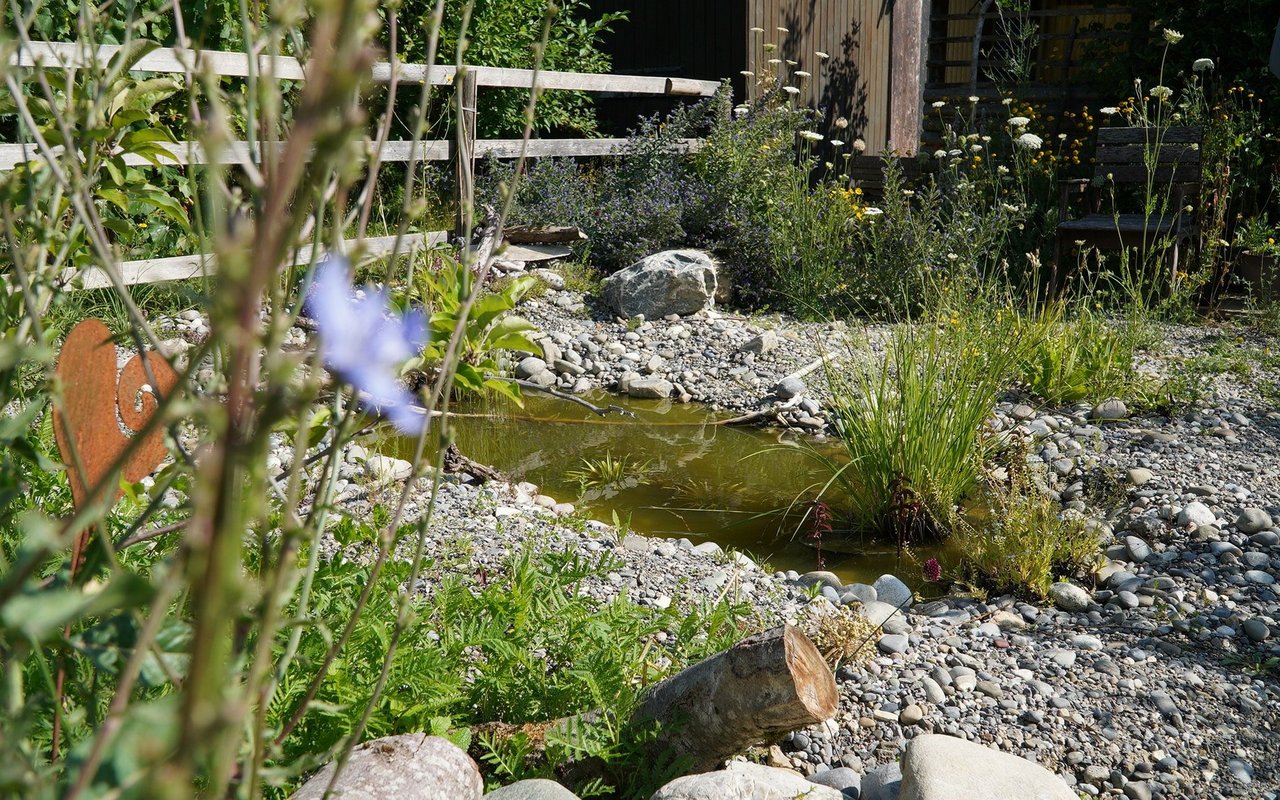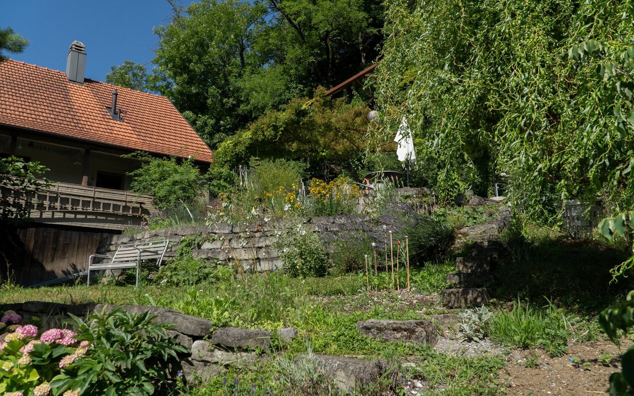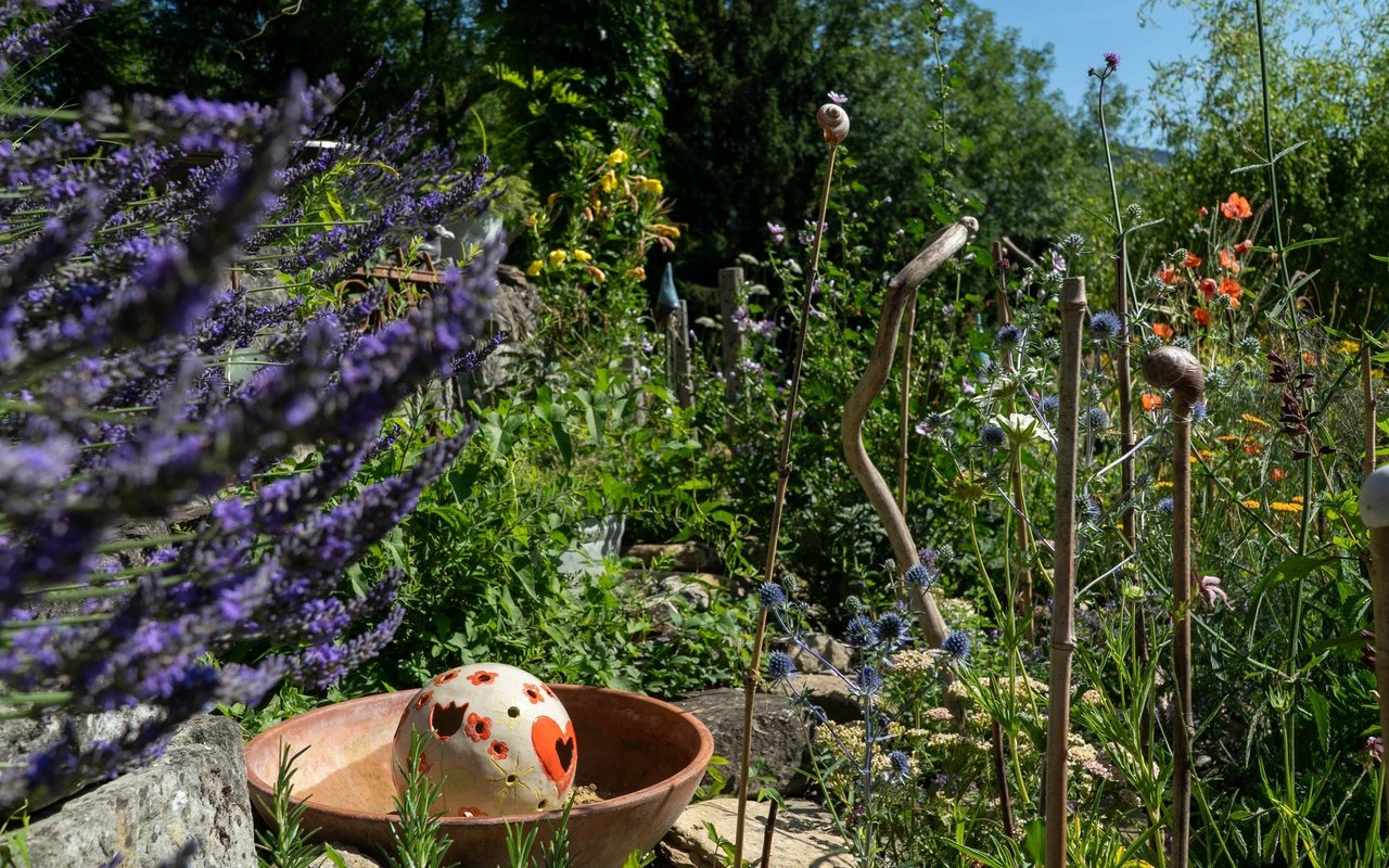 Eigentlich wollte Mira Romer nur eine Abwechslung zum Alltag als Mutter. «Aber es ist immer mehr geworden», sagt die 51-Jährige heute lachend. Von ihrer Terrasse aus am Südhang in Altstätten blickt man auf die Österreicher Alpen, über Rheintal und ihren 1000m2 grossen Garten, den sie seit 10 Jahren intensiv bearbeitet und gestaltet: Hier blühen diverse Wildblumen auf drei selbst gebauten Trockensteinmauer-Ebenen mit Wassertrögen und Lehmhaufen für Wildbienen. Im unteren Teil des Gartens wird es etwas wilder. Hier will die gelernte Köchin eine Permakultur anlegen und setzt auf einheimisches Gehölz und Wildobst wie Aronia, Schlehdorn, Holunder, Sanddorn, Kornelkirsche und wilde Mirabellen. Etwas versteckt zwischen den Bäumen, hinter den Hochbeeten und dem Gewächshaus steht eine grosse Benjeshecke mit viel Totholz, Ästen und Laub, daneben ein kleiner Teich. Weiter vorne beim 114-jährigen Holzhaus finden Wildtiere Nahrung und Unterschlupf in diversen Stein- und Totholzstrukturen und Wildblumen.