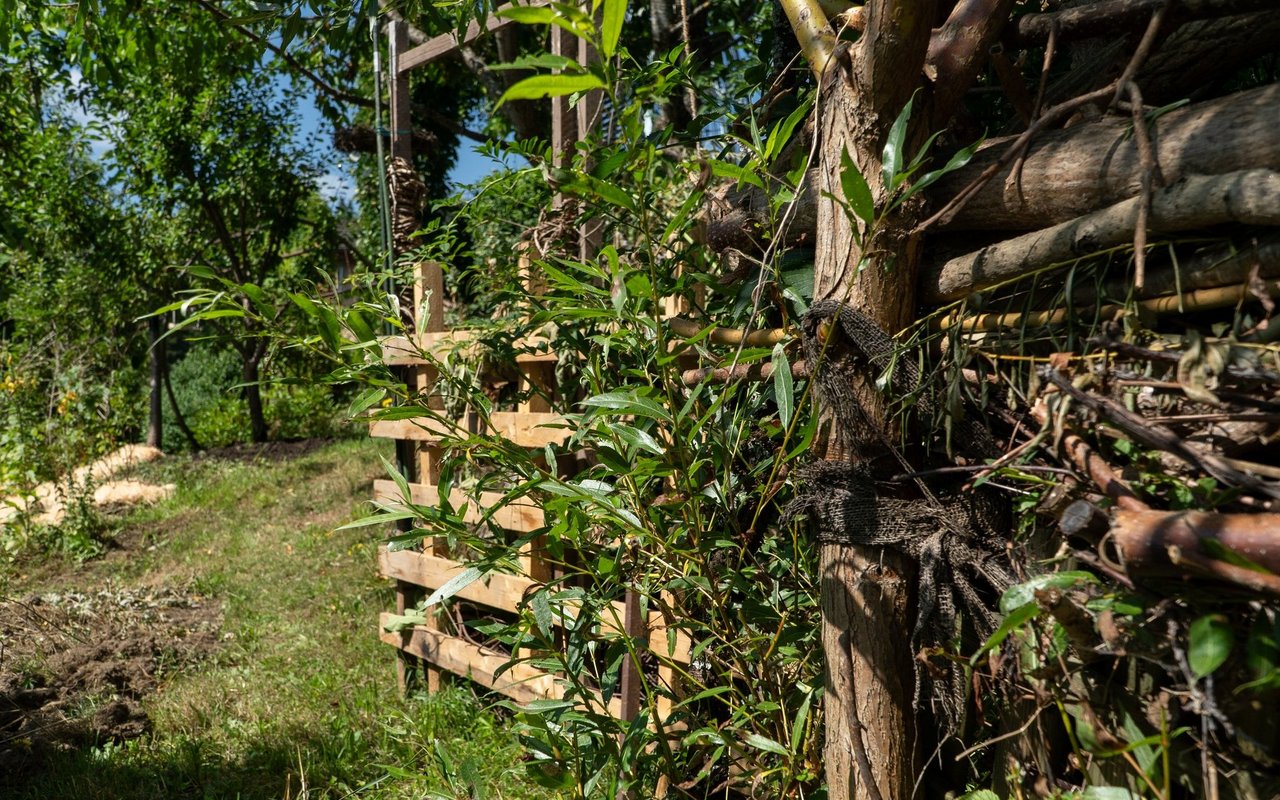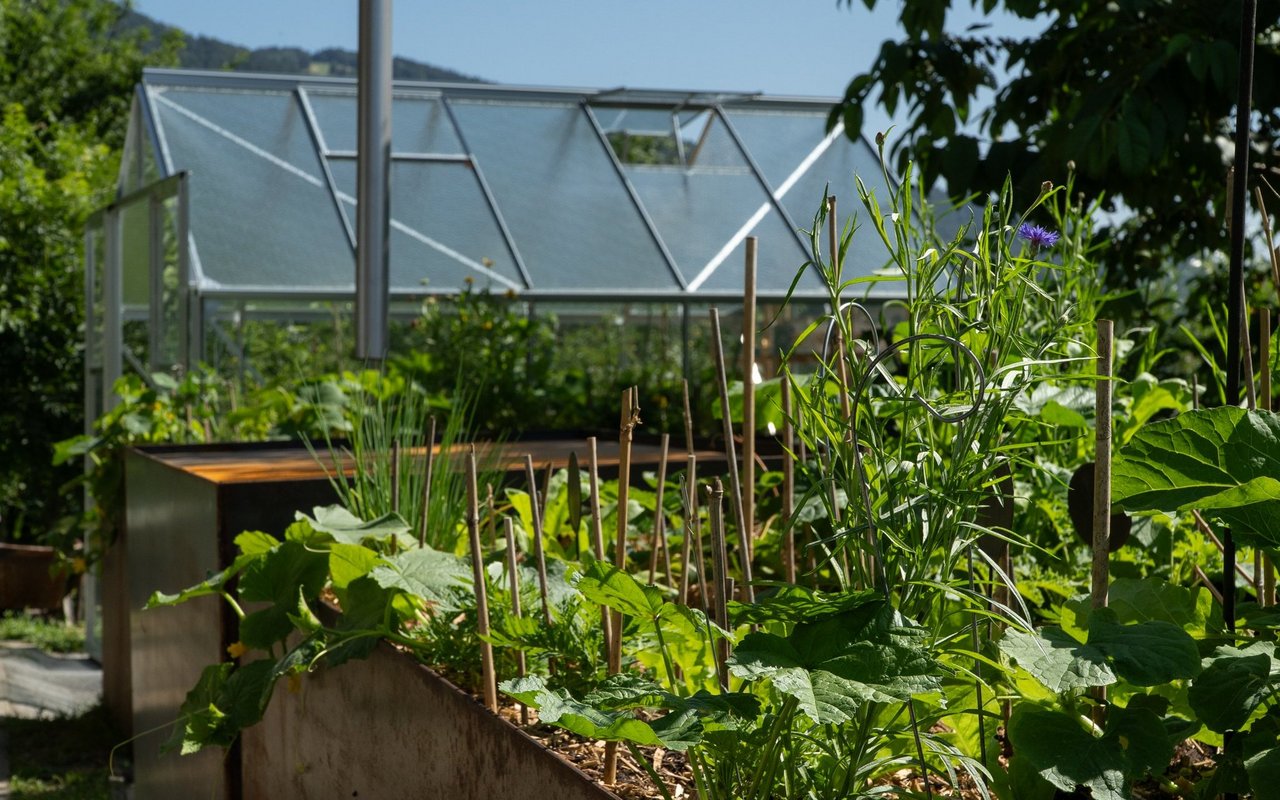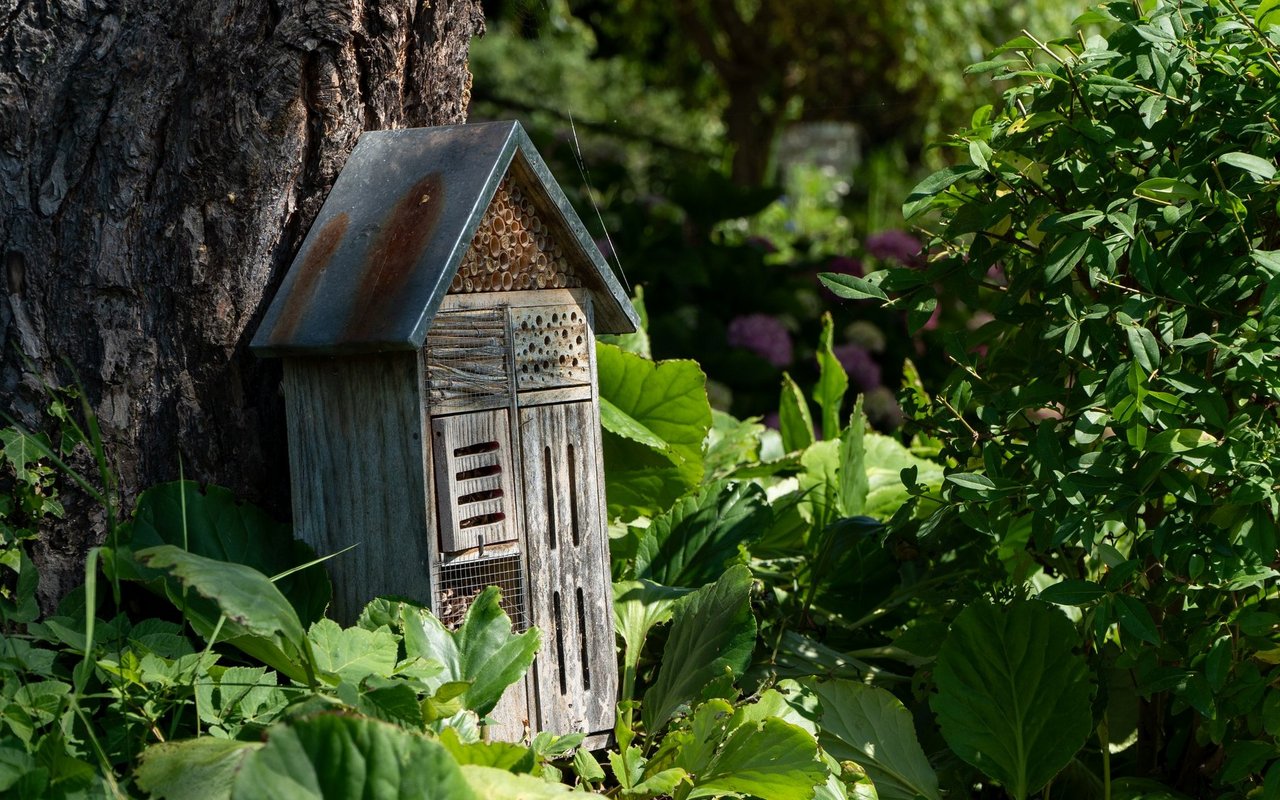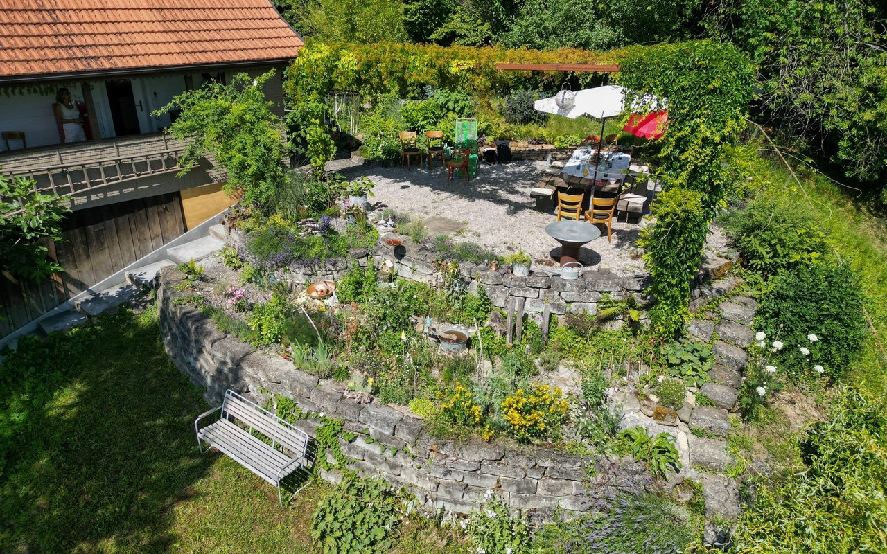 Eigentlich wollte Mira Romer nur eine Abwechslung zum Alltag als Mutter. «Aber es ist immer mehr geworden», sagt die 51-Jährige heute lachend. Von ihrer Terrasse aus am Südhang in Altstätten blickt man auf die Österreicher Alpen, über Rheintal und ihren 1000m2 grossen Garten, den sie seit 10 Jahren intensiv bearbeitet und gestaltet: Hier blühen diverse Wildblumen auf drei selbst gebauten Trockensteinmauer-Ebenen mit Wassertrögen und Lehmhaufen für Wildbienen. Im unteren Teil des Gartens wird es etwas wilder. Hier will die gelernte Köchin eine Permakultur anlegen und setzt auf einheimisches Gehölz und Wildobst wie Aronia, Schlehdorn, Holunder, Sanddorn, Kornelkirsche und wilde Mirabellen. Etwas versteckt zwischen den Bäumen, hinter den Hochbeeten und dem Gewächshaus steht eine grosse Benjeshecke mit viel Totholz, Ästen und Laub, daneben ein kleiner Teich. Weiter vorne beim 114-jährigen Holzhaus finden Wildtiere Nahrung und Unterschlupf in diversen Stein- und Totholzstrukturen und Wildblumen.
