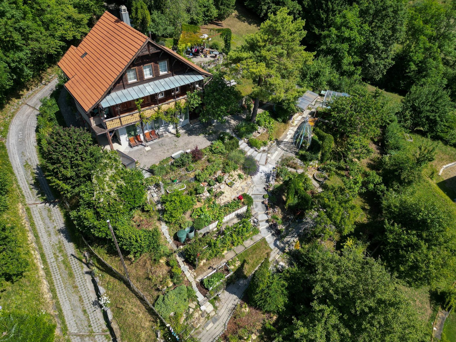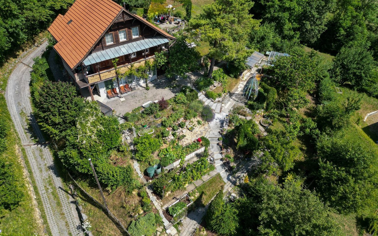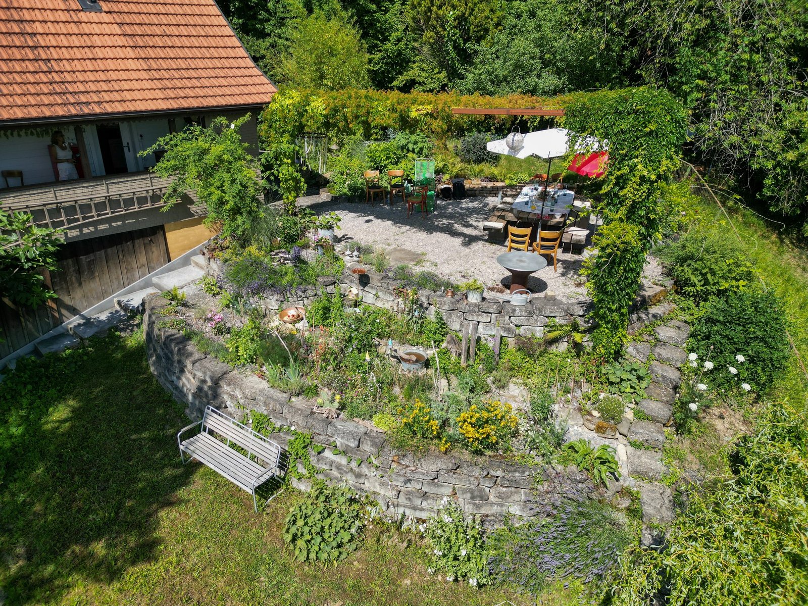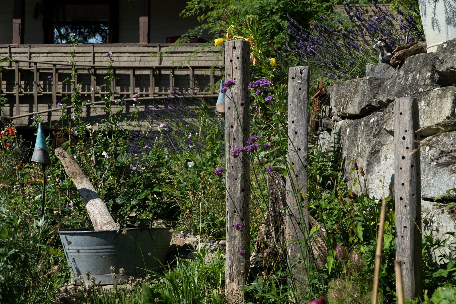 Eigentlich wollte Mira Romer nur eine Abwechslung zum Alltag als Mutter. «Aber es ist immer mehr geworden», sagt die 51-Jährige heute lachend. Von ihrer Terrasse aus am Südhang in Altstätten blickt man auf die Österreicher Alpen, über Rheintal und ihren 1000m2 grossen Garten, den sie seit 10 Jahren intensiv bearbeitet und gestaltet: Hier blühen diverse Wildblumen auf drei selbst gebauten Trockensteinmauer-Ebenen mit Wassertrögen und Lehmhaufen für Wildbienen. Im unteren Teil des Gartens wird es etwas wilder. Hier will die gelernte Köchin eine Permakultur anlegen und setzt auf einheimisches Gehölz und Wildobst wie Aronia, Schlehdorn, Holunder, Sanddorn, Kornelkirsche und wilde Mirabellen. Etwas versteckt zwischen den Bäumen, hinter den Hochbeeten und dem Gewächshaus steht eine grosse Benjeshecke mit viel Totholz, Ästen und Laub, daneben ein kleiner Teich. Weiter vorne beim 114-jährigen Holzhaus finden Wildtiere Nahrung und Unterschlupf in diversen Stein- und Totholzstrukturen und Wildblumen.
