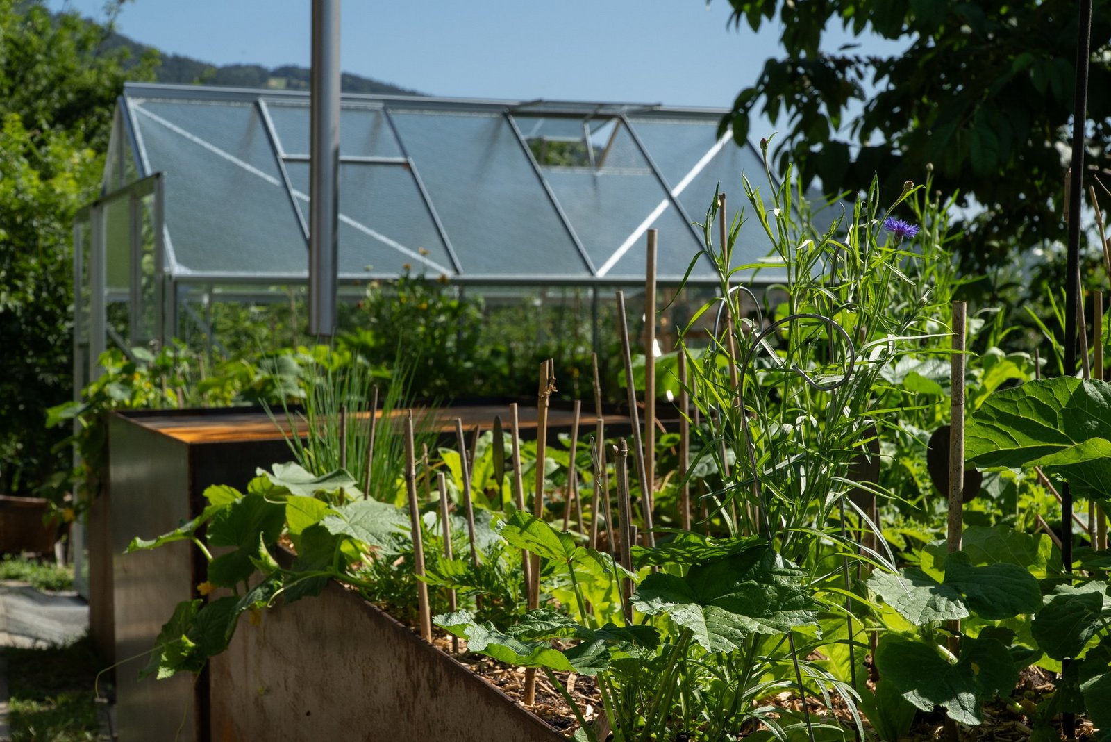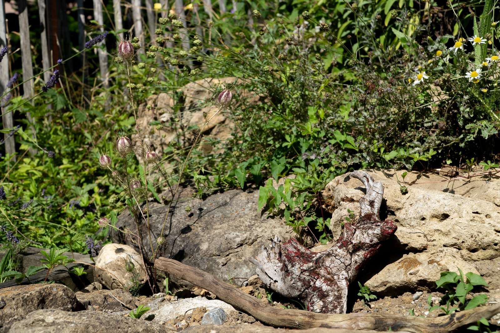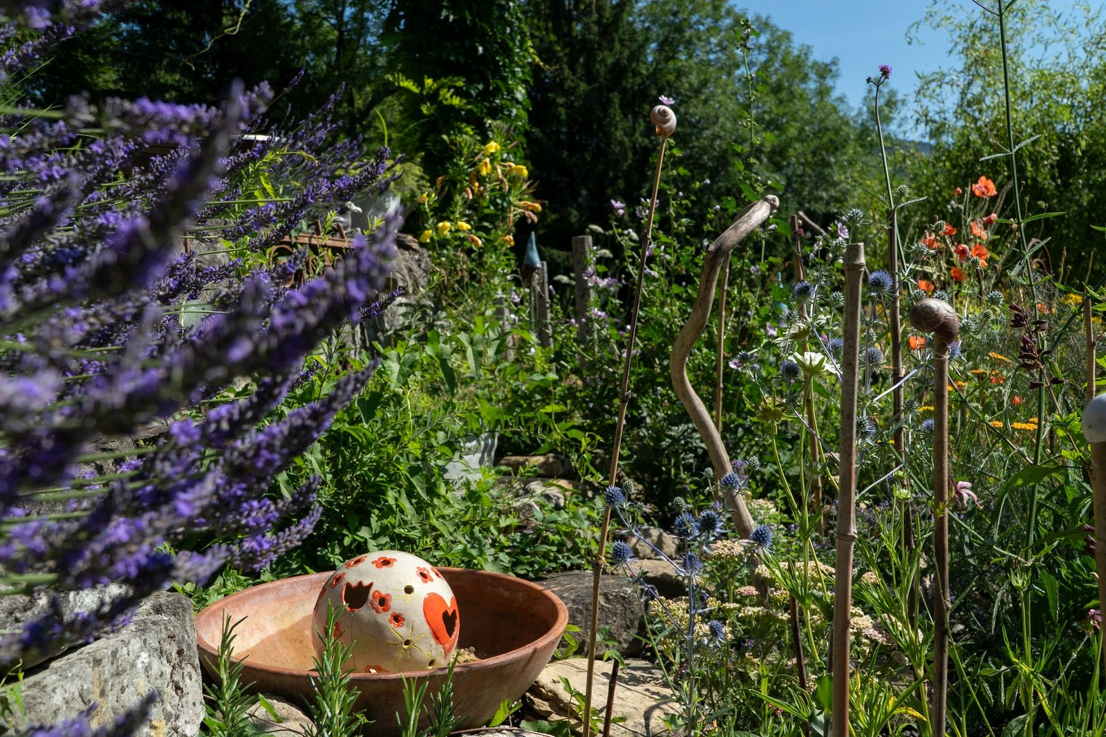 Weitere Wildblumen, Wildstauden und ein Kräuterbeet, ein Steingarten und Permakulturen.