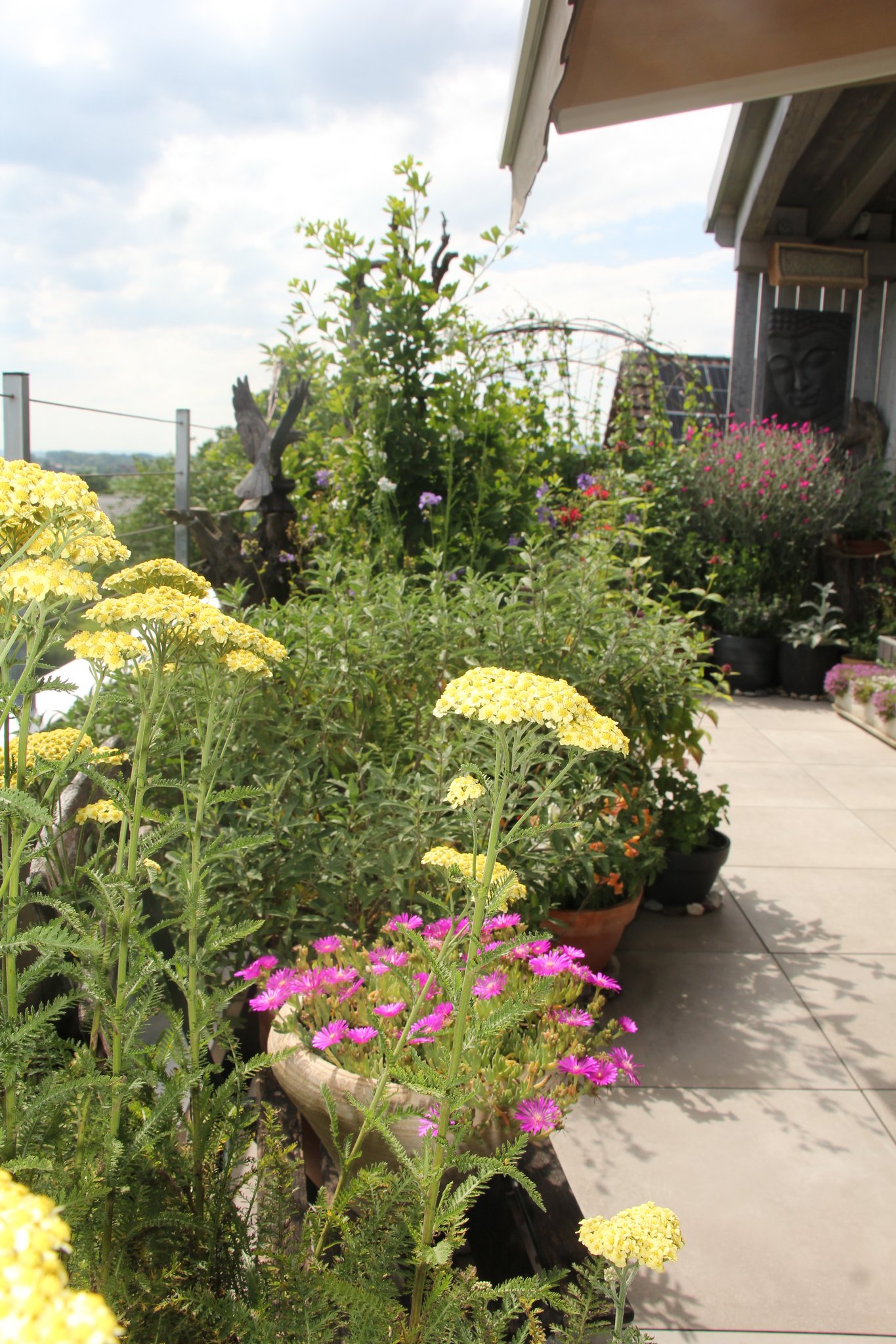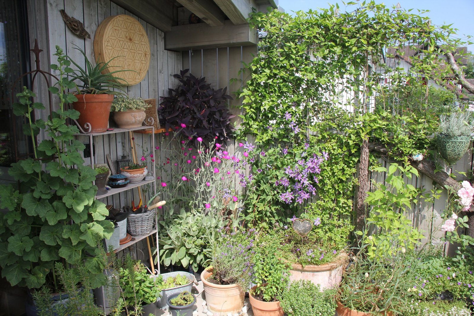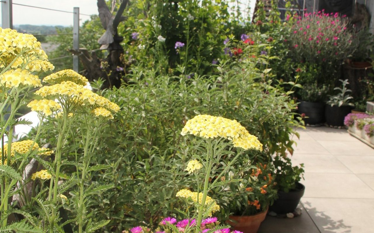 Entsprechend hat er zusammen mit seiner Frau Annja die Terrasse eingerichtet und die Pflanzen zusammengestellt. Das Ziel sei, dass immer etwas blühe. Waldreben ranken an der Seite empor, Kuckuckslicht- und Kronlichtnelken, Mädesüss, Ringel- und Bartblumen entfalten sich, das Mutterkraut bildet einen Blütenteppich.