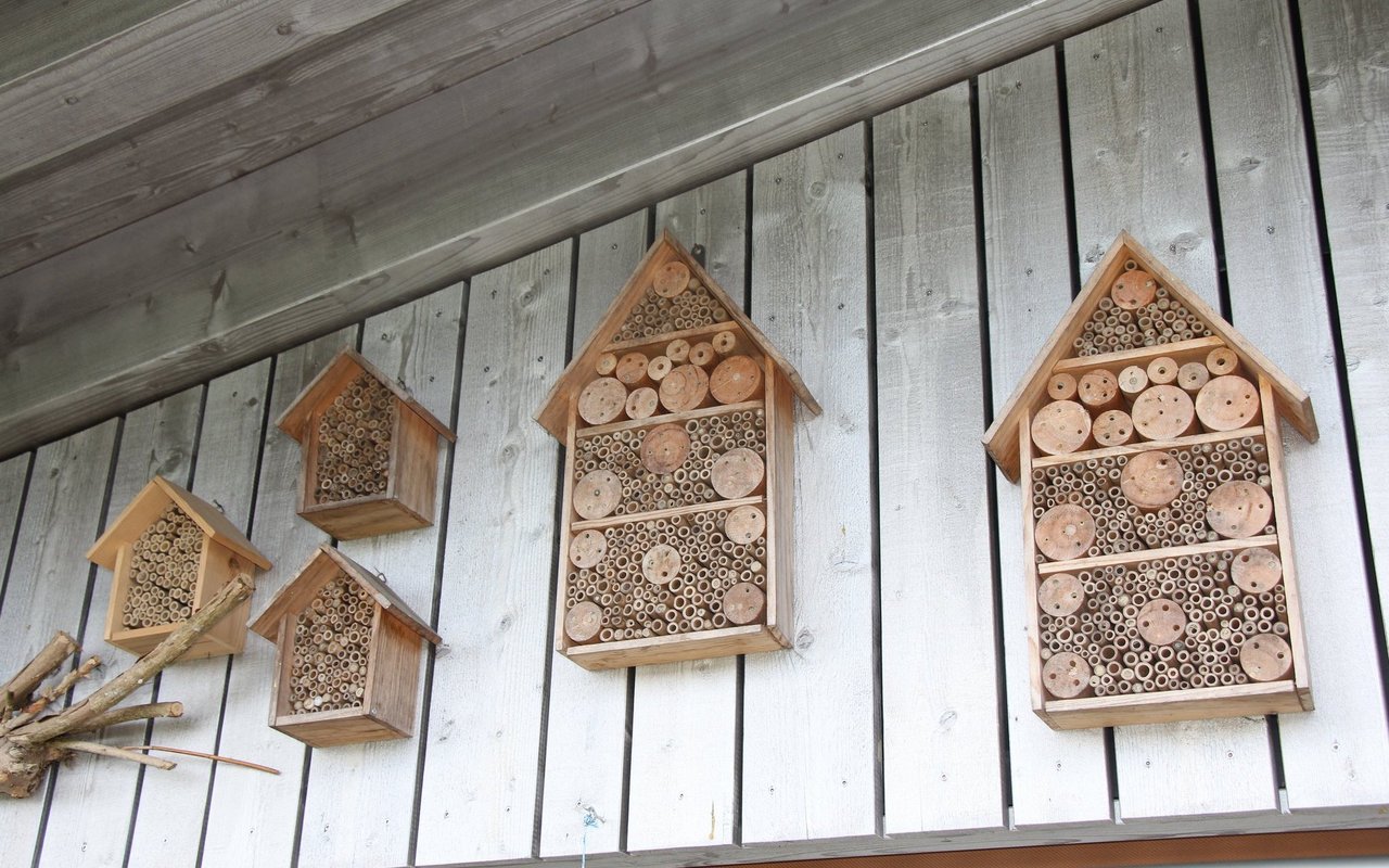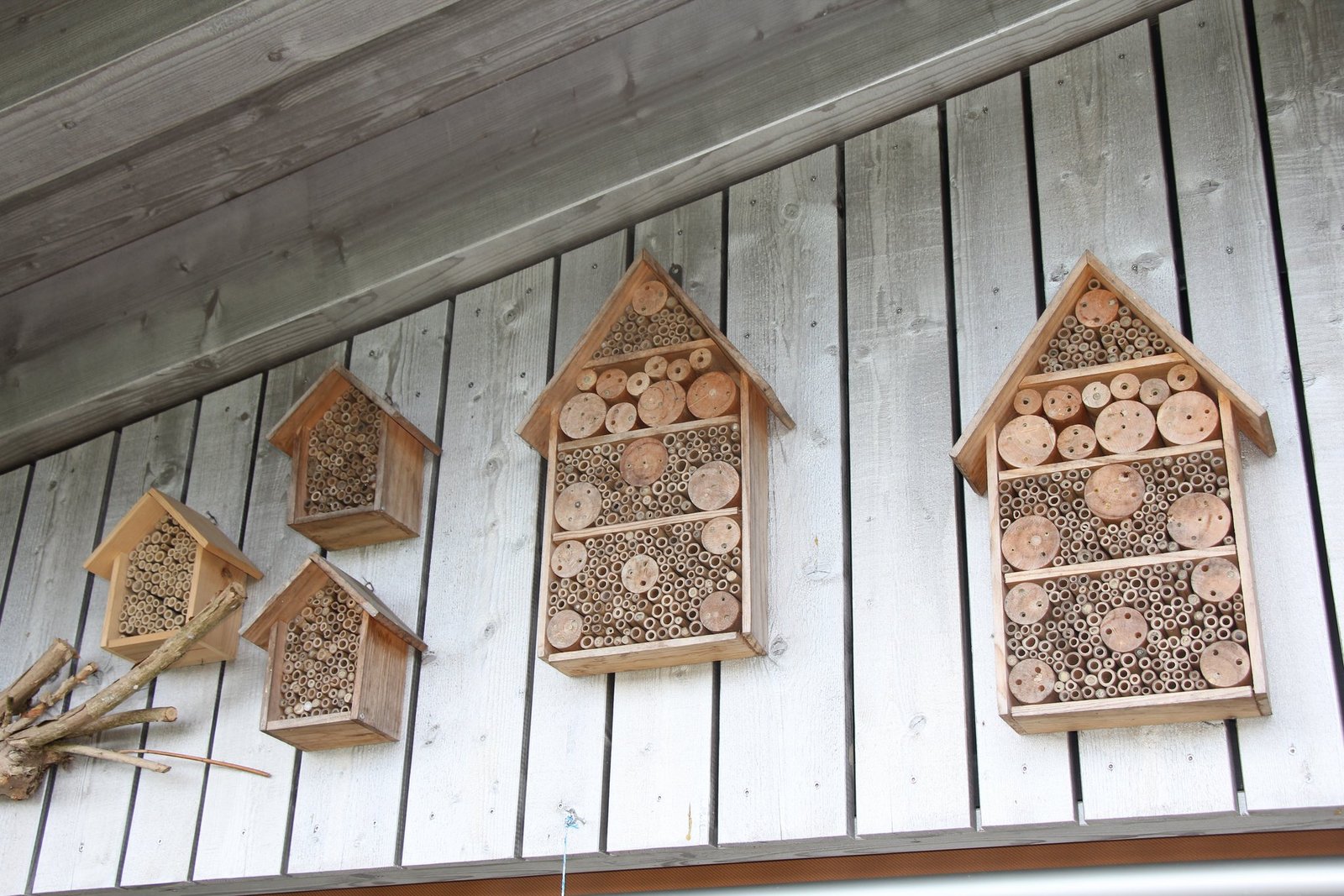 Die Wildbienen-Behausungen am richtigen Ort befestigen, nämlich wettergeschützt, Löcher immer seitwärts bohren und darauf achten, dass sich darin keine Splitter befinden.