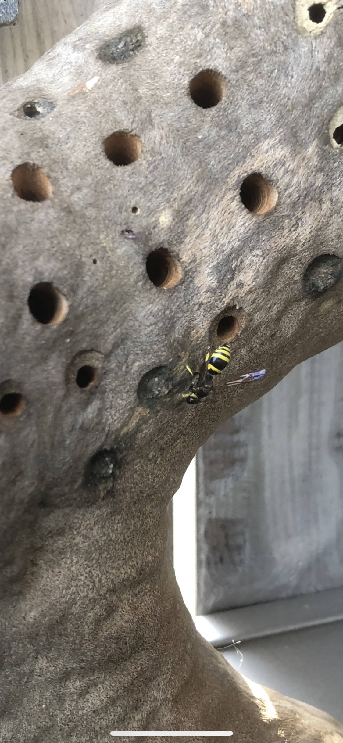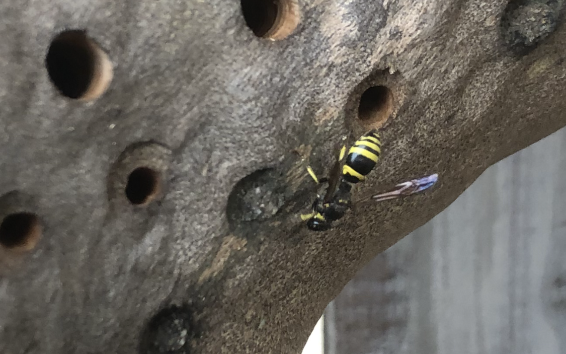 Für ihn und seine Frau steht die Natur im Vordergrund, ob bei Spaziergängen mit ihrem Hund Javi, im Beruf oder zu Hause. «Wir sind immer dran», sagt Annja Cecchele, die gerade versucht, das Taubenschwänzchen zu fotografieren, derweil eine Goldwespe vor einem Loch in einem Hartholzstück schwirrt.