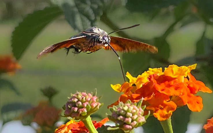 Die Blaue Holzbiene und das Taubenschwänzchen. Letztes Jahr war das Heupferd besonders spektakulär.