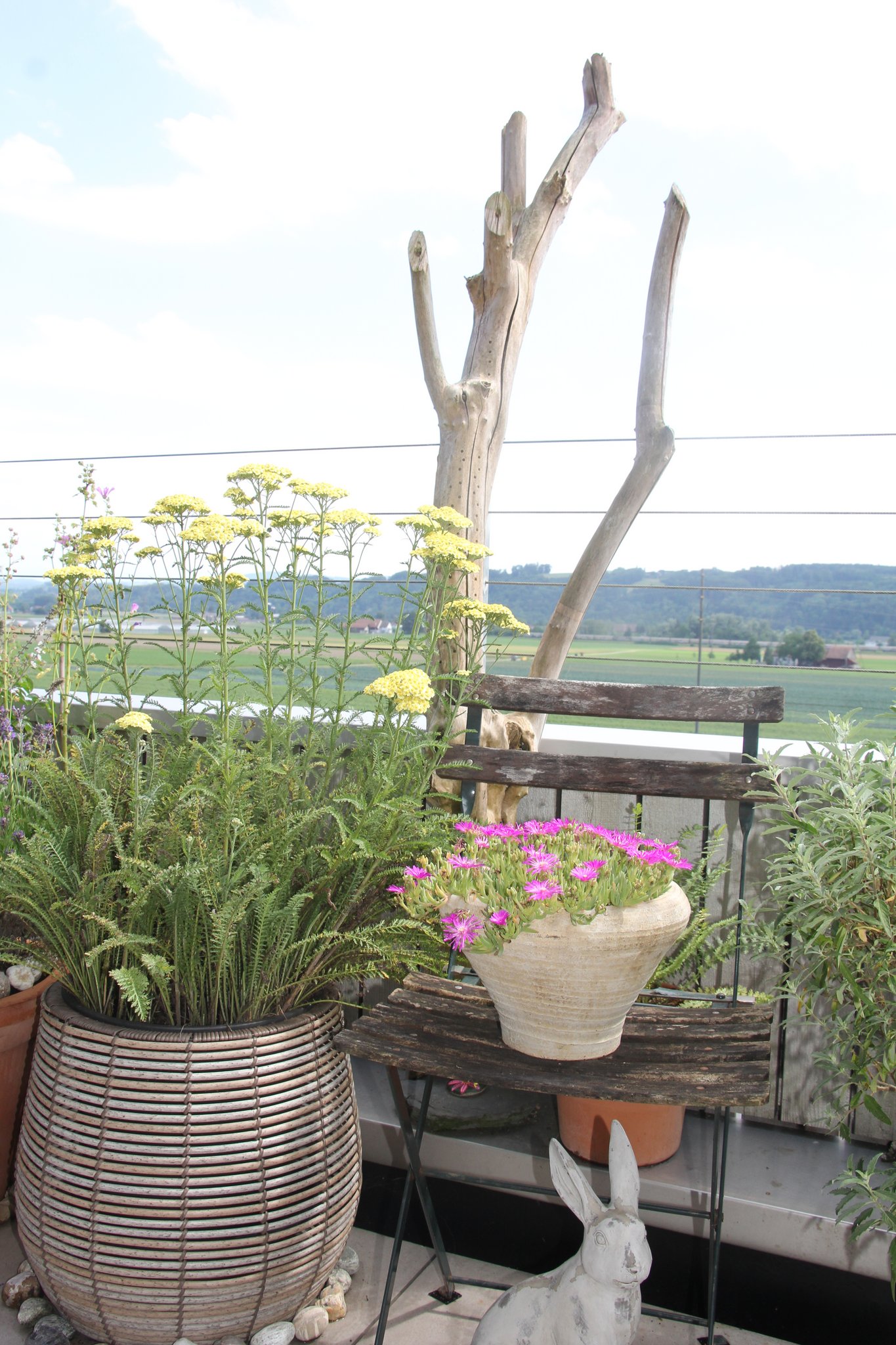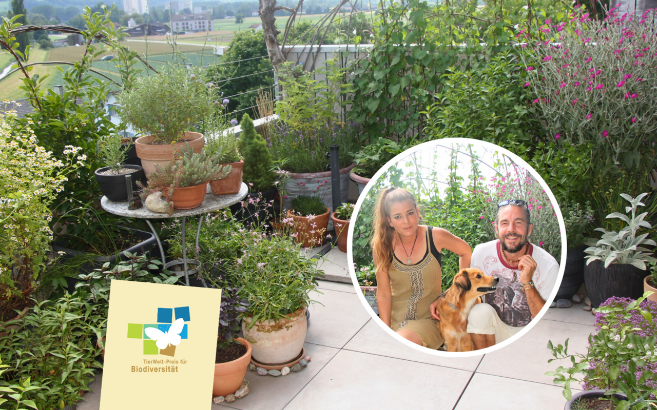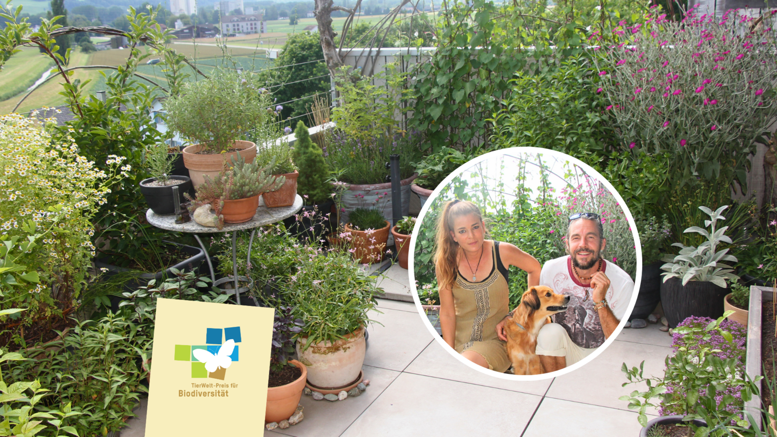 Sandro und Annja Cecchele haben ihre Terrasse in ein Insektenrefugium verwandelt. Die Krabbeltiere werden durch zahlreiche Blütenpflanzen und Altholz angelockt.