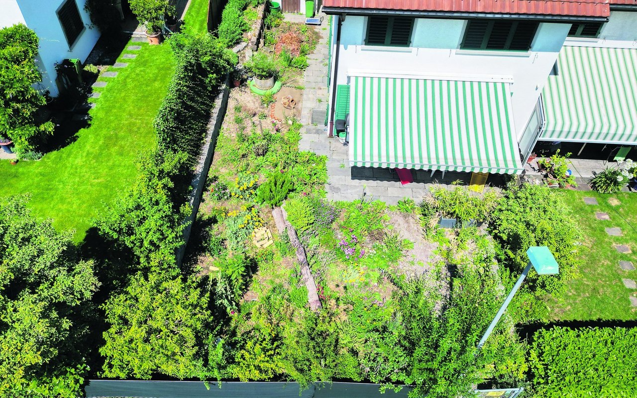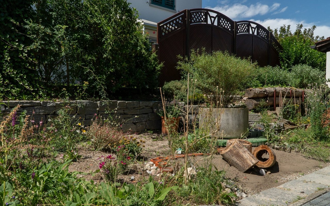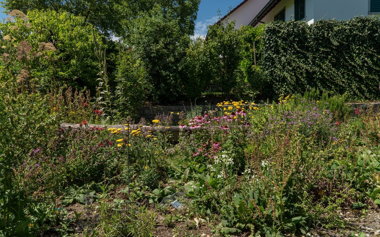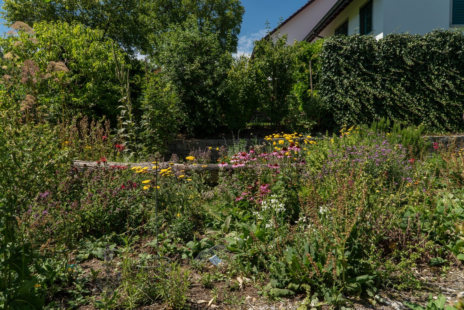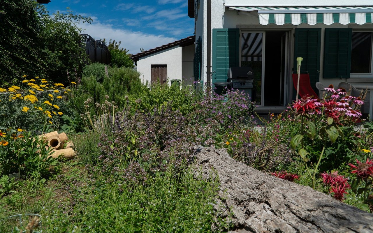 Früher pflegte Susi Manser einen englischen Garten mit grünem Rasen und Kirschlorbeer-Hecken. Während ihrer Ausbildung zur eidgenössisch diplomierten Imkerin im Jahr 2020 riss sie die Neophyten aber aus und setzte stattdessen auf den 100 m2 einen artenreichen Wildpflanzengarten, der von Februar bis Dezember blüht und Nahrung für jegliche Bienenarten bietet. So wachsen im Einfamilienhaus-Garten Wegwarte, Natternköpfe, Wiesensalbei, Dost, Baldrian, Flockenblume, Heilzeist, Muskatellersalbei, Nachtkerze, Kornelkirsche, Schwarz- und Weissdorn und vieles mehr auf engstem Raum. Unzählige Wild- und Honigbienen sowie Schmetterlinge machen sich gleichermassen über das Blütenmeer her. «Ich möchte zeigen, dass Wildbienen und Honigbienen nebeneinander existieren können», sagt Manser. Besonders Freude hat sie an der Königskerze, die sich im Garten breit macht und die bis zu ihrem Absterben vier Jahre lang ökologisch wertvoll sei.