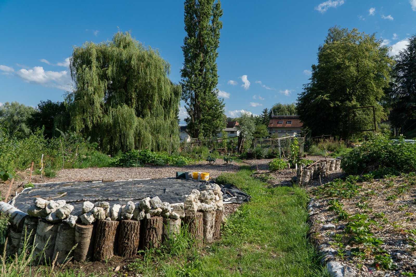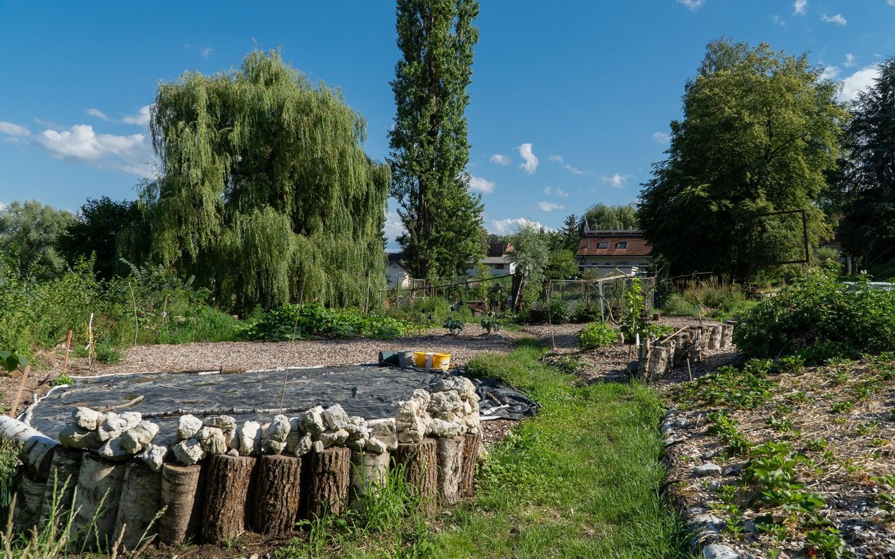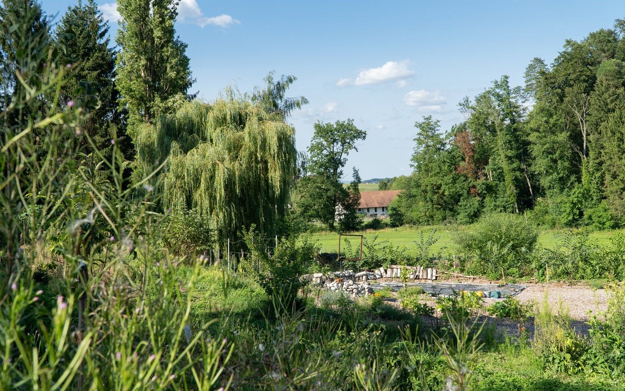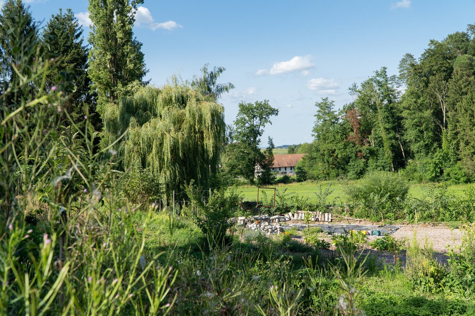 Am Hang wachsen diverse junge Obstbäume und Wildstauden: Hochstamm Apfelbäume, Walnuss, Marroni, Bayerische Kiwi, Mispel und vieles mehr. Das Herz seines Gartens, wie er es nennt, ist der grosse Kompost zwischen dem vorderen und dem hinteren Bereich. Das Ganze wird gegen Westen durch eine wilde Wiese und eine 90 Meter lange Benjeshecke zum Nachbaren abgegrenzt. Dort haben sich bereits diverse Kröten und Frösche in drei kleinen Teichen eingenistet, die sich zwischen Rohrkolben und Seerosen zuhause fühlen. «Es wird jedes Jahr schöner», sagt Jeutter. Er habe aber noch ganz viel vor, etwa weitere Trockensteinmauern oder einen Käferkeller bauen.