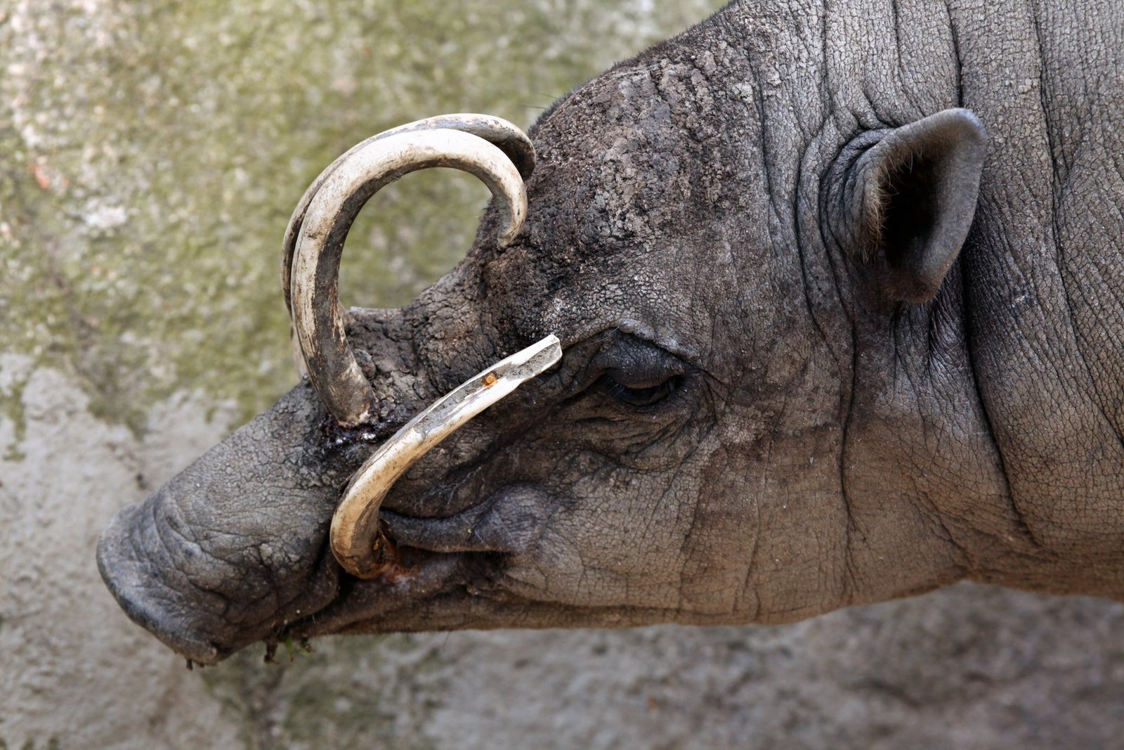 Sein «Geweih» an seinem Rüssel verleiht dem Hirscheber ein imposantes Aussehen. Die Hauer wachsen durch die Rüsseldecke nach oben und bilden einen Bogen.