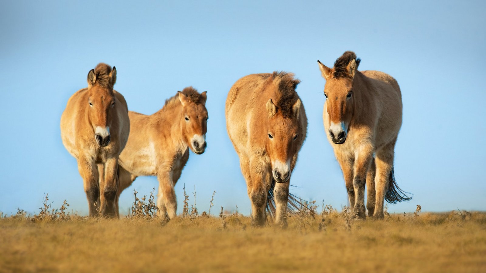 Die kleinen beigen Urpferde mit schwarzem Aalstrich galten lange als in der Wildnis ausgestorben. Rücksiedlungsprogramme versuchen Populationen des Urpferdes in den kargen und klimatisch harten Gebieten der Eurasischen Wüsten wieder anzusiedeln.