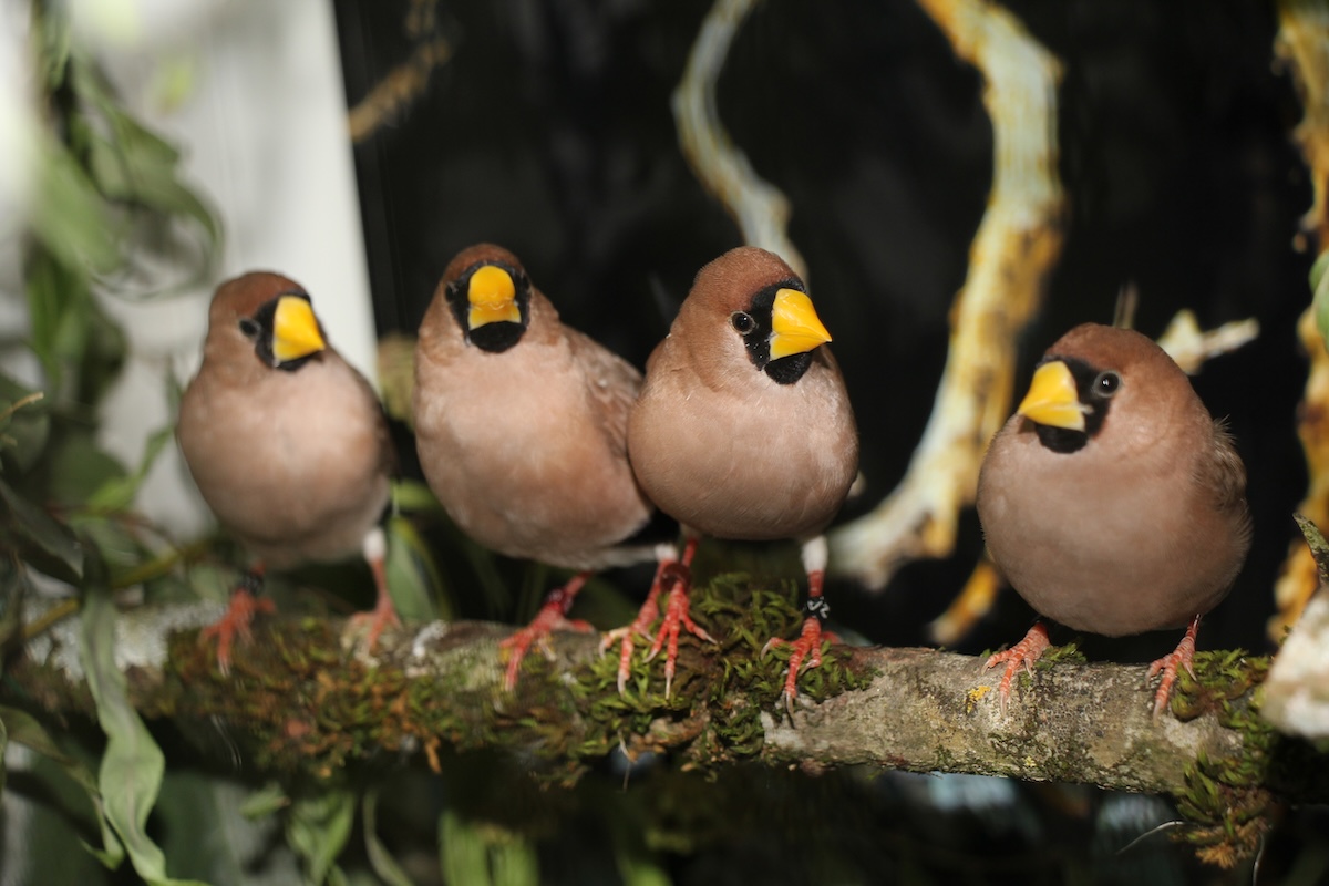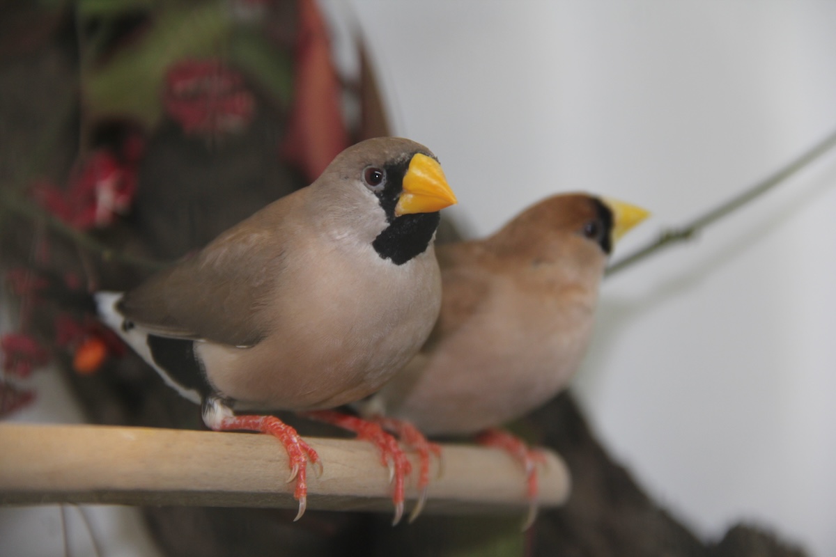 Maskenamadinen haben ein unverwechselbares Aussehen mit ihrem dicken, gelben Schnabel und dem schwarzen Rund, das sich ums Gefieder um den Schnabel zieht. Die Prachtfinken aus heissen Bereichen Australiens sind gesellige und sehr verträgliche Volierenpfleglinge.
